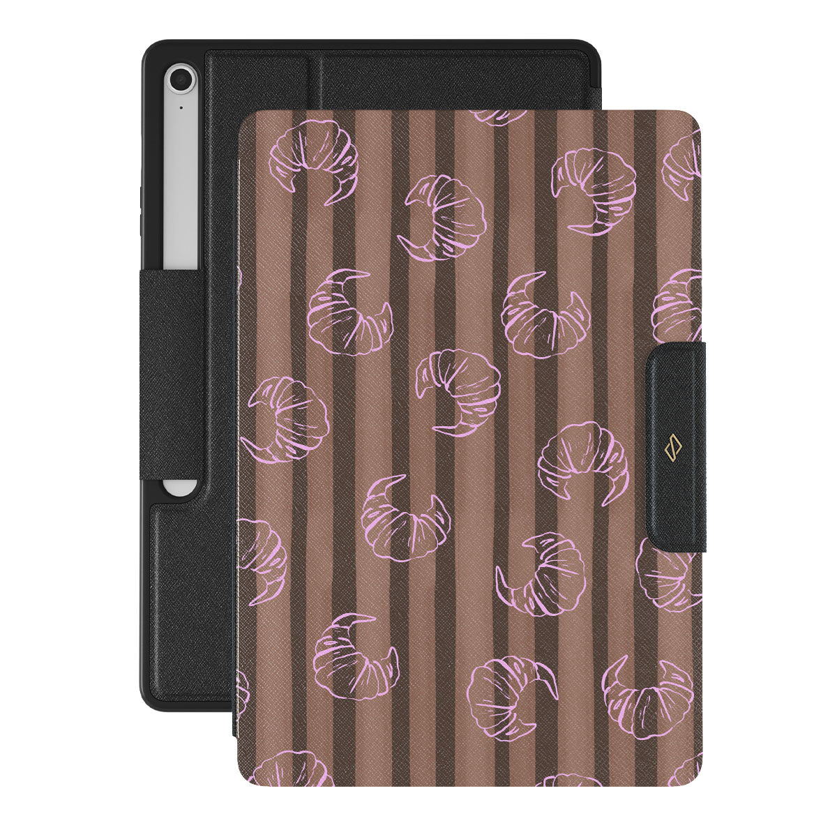 Características de este diseño: rayas verticales, rayas cafés y beige, croissants
