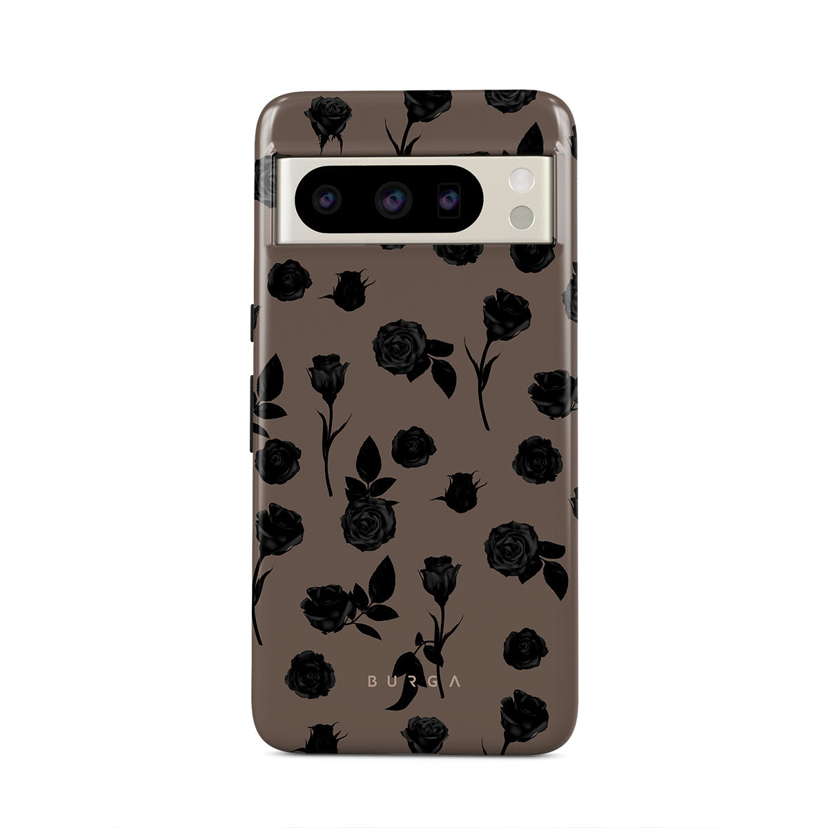 En este diseño: rosas negras, tonos terrosos, detalles florales y flores oscuras.