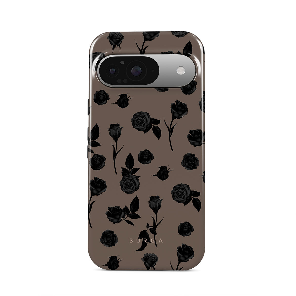 En este diseño: rosas negras, tonos terrosos, detalles florales y flores oscuras.