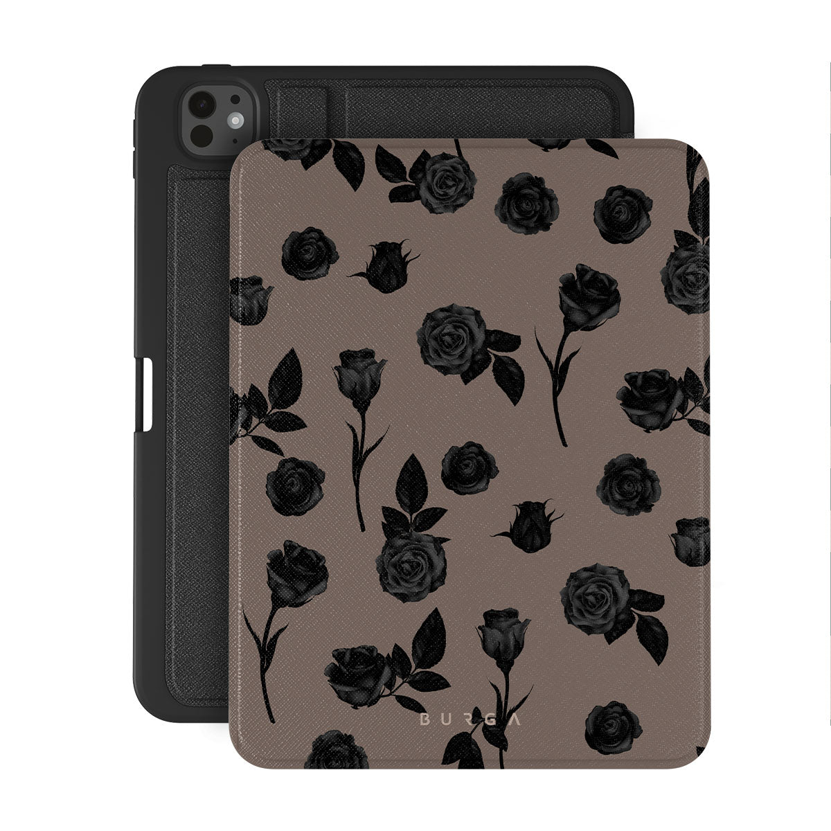 En este diseño: rosas negras, tonos terrosos, detalles florales y flores oscuras.