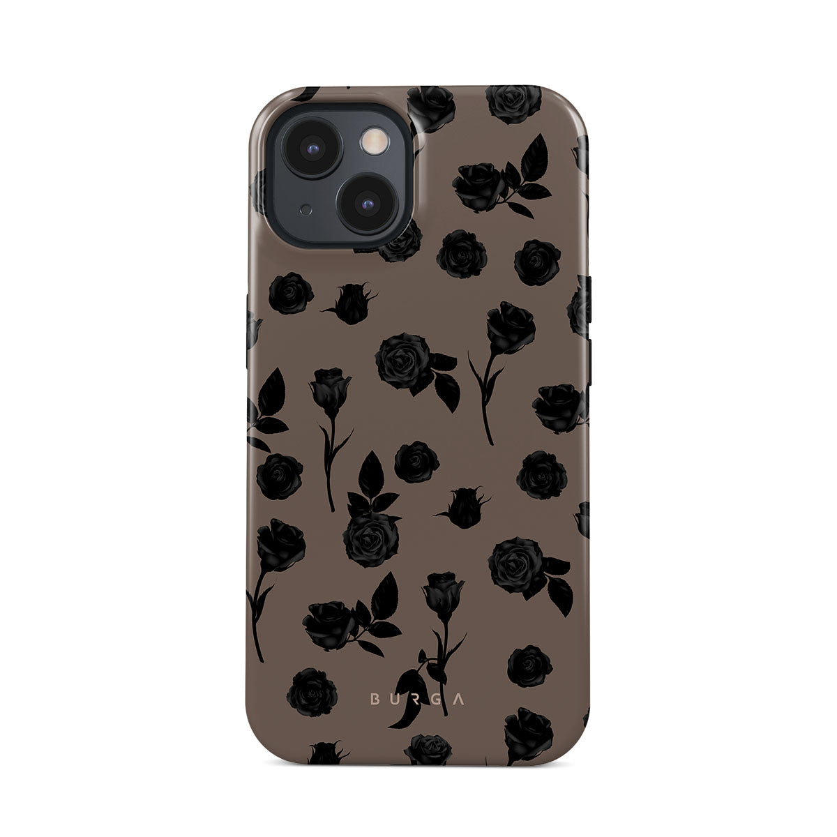 En este diseño: rosas negras, tonos terrosos, detalles florales y flores oscuras.