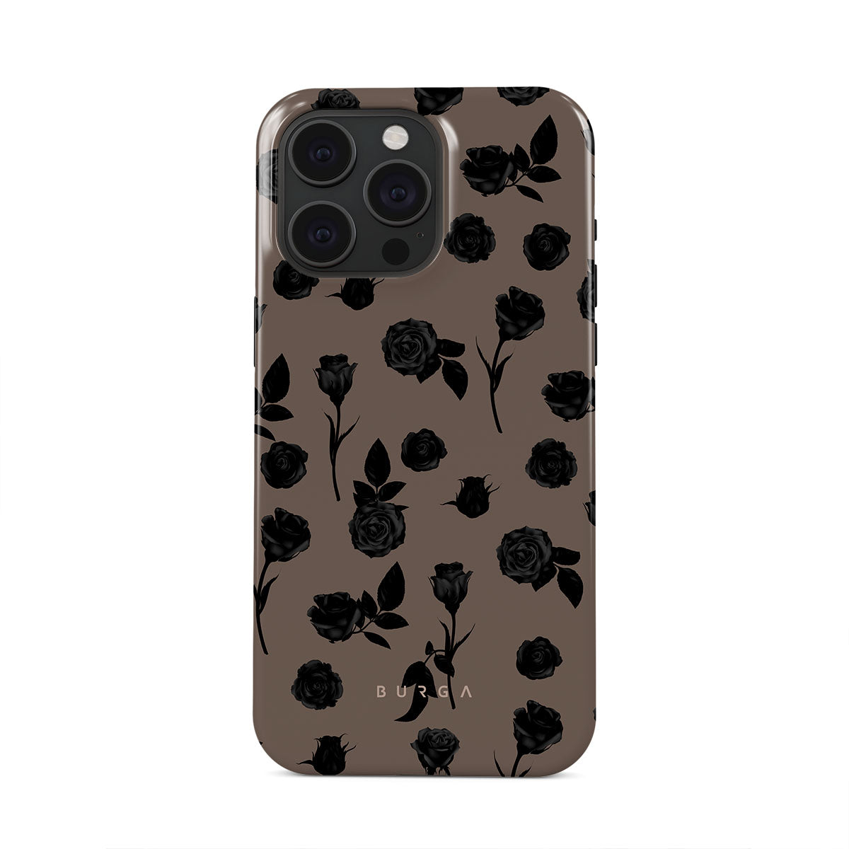 En este diseño: rosas negras, tonos terrosos, detalles florales y flores oscuras.