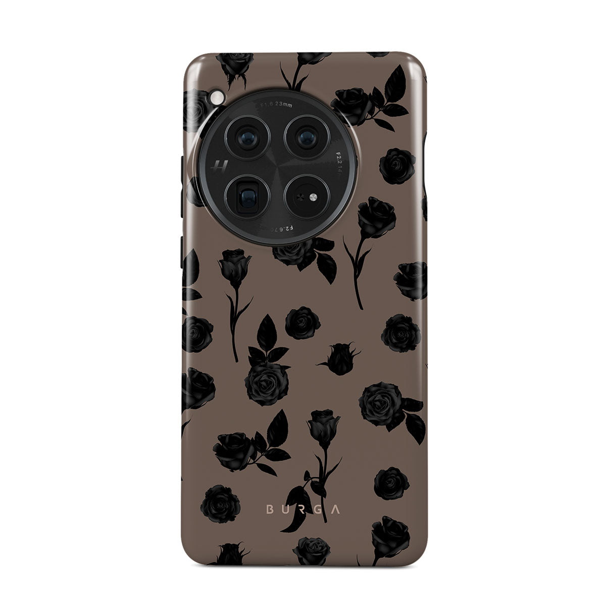 En este diseño: rosas negras, tonos terrosos, detalles florales y flores oscuras.