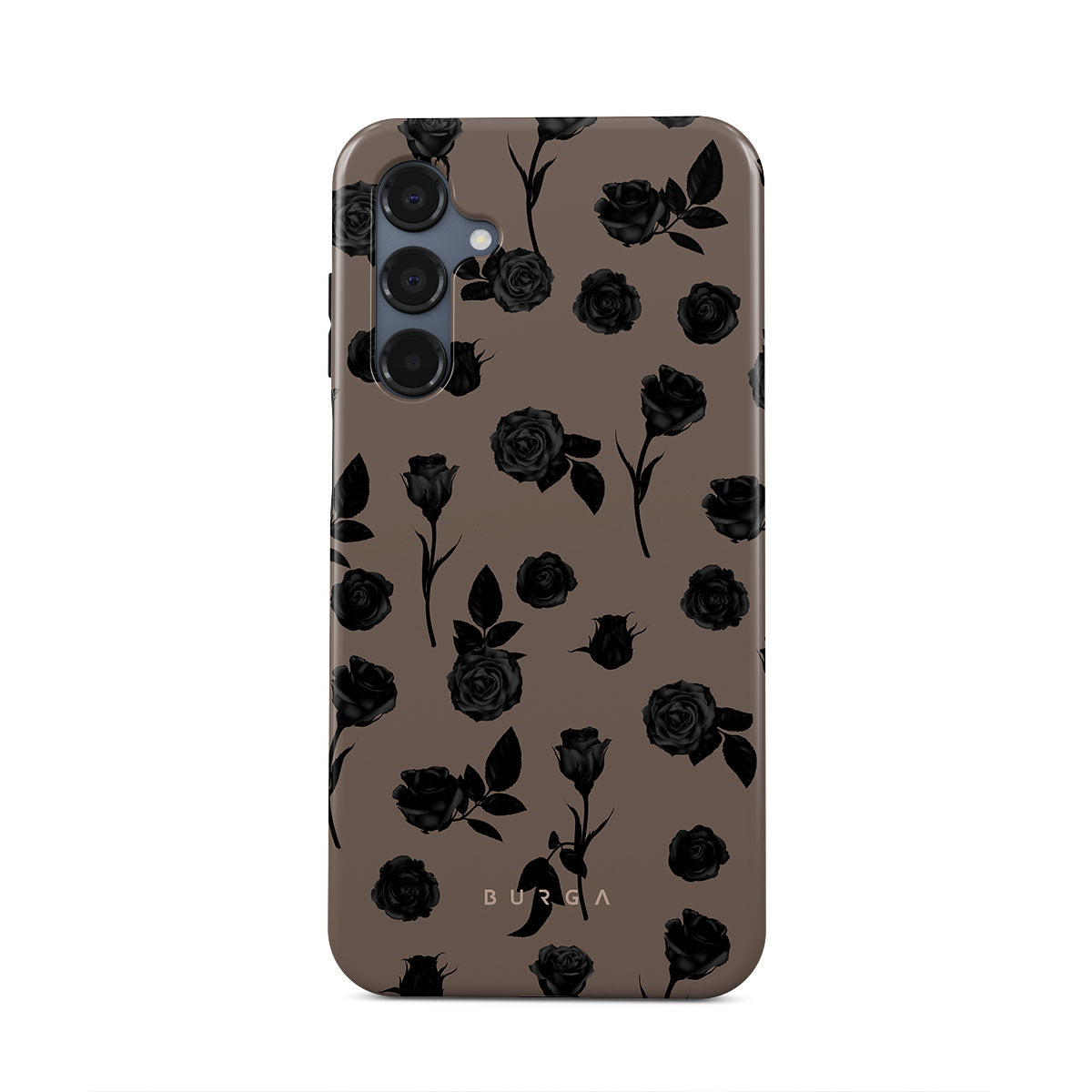En este diseño: rosas negras, tonos terrosos, detalles florales y flores oscuras.