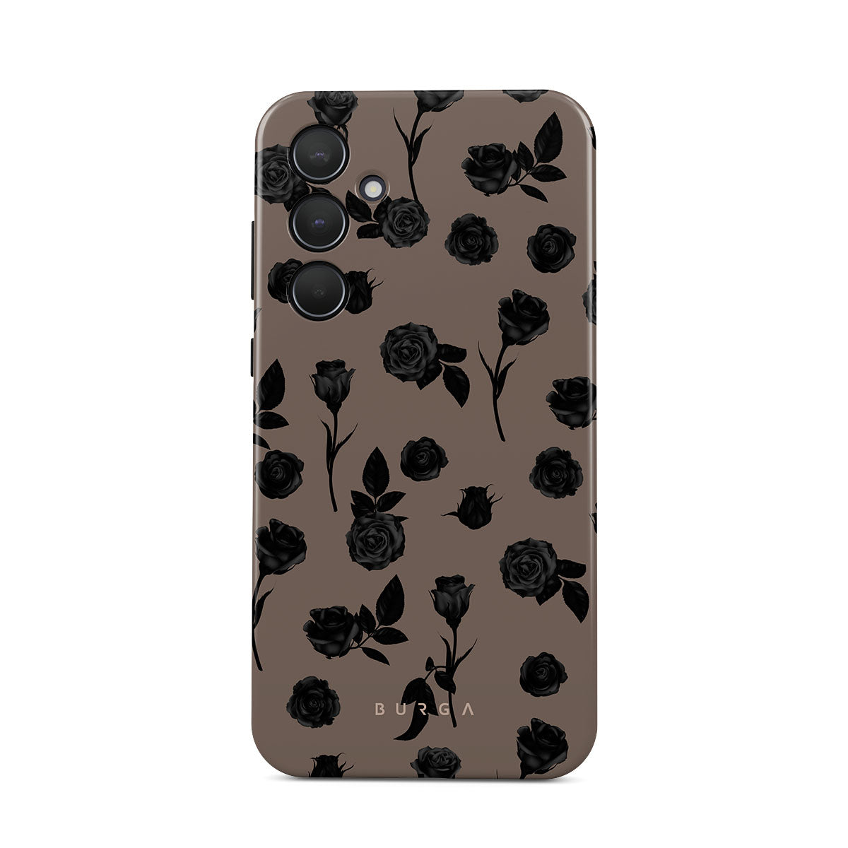 En este diseño: rosas negras, tonos terrosos, detalles florales y flores oscuras.