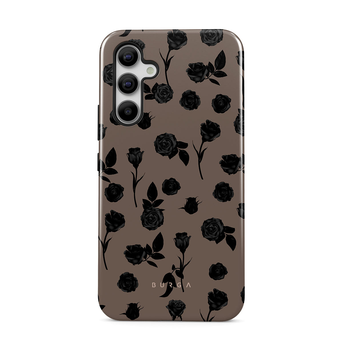 En este diseño: rosas negras, tonos terrosos, detalles florales y flores oscuras.