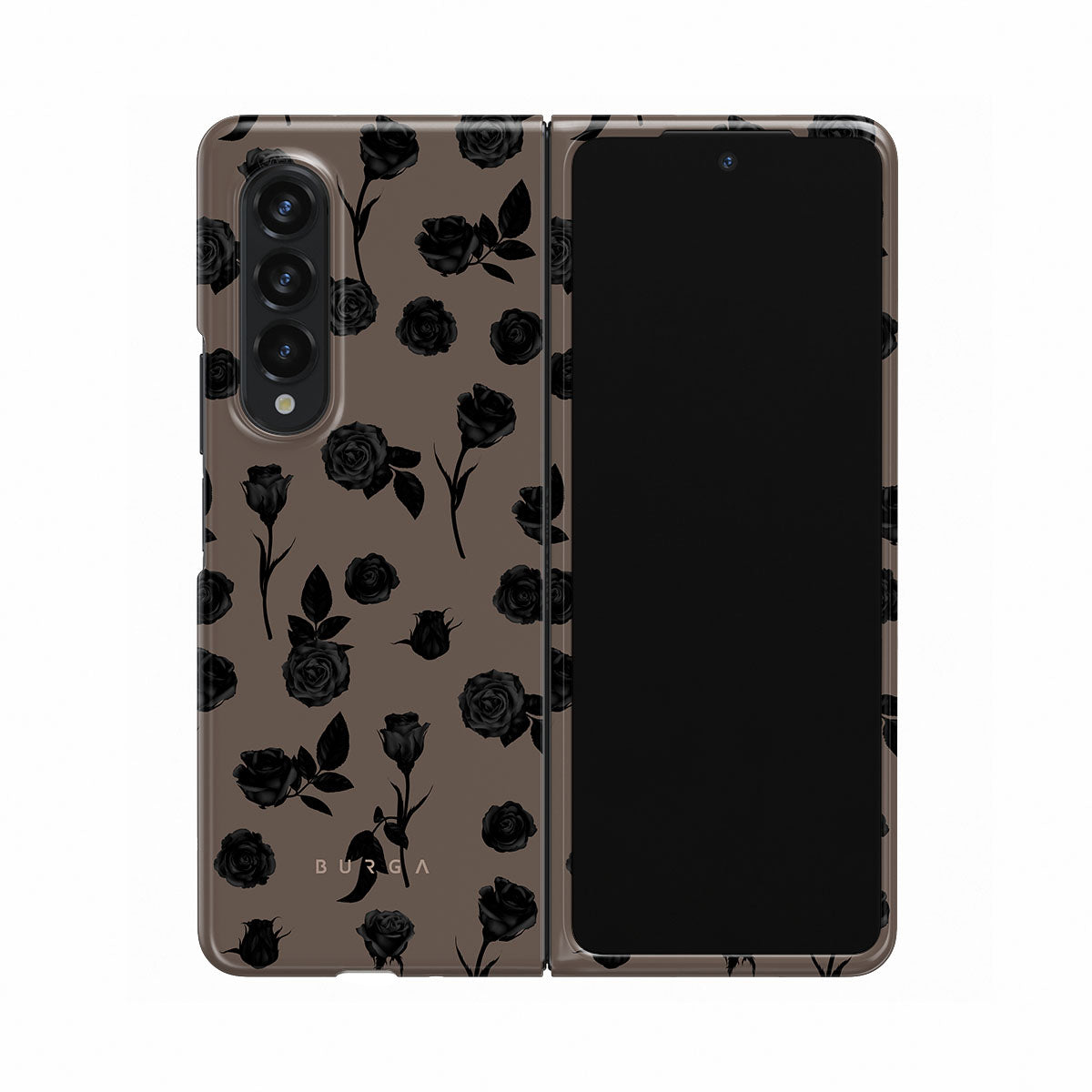 En este diseño: rosas negras, tonos terrosos, detalles florales y flores oscuras.