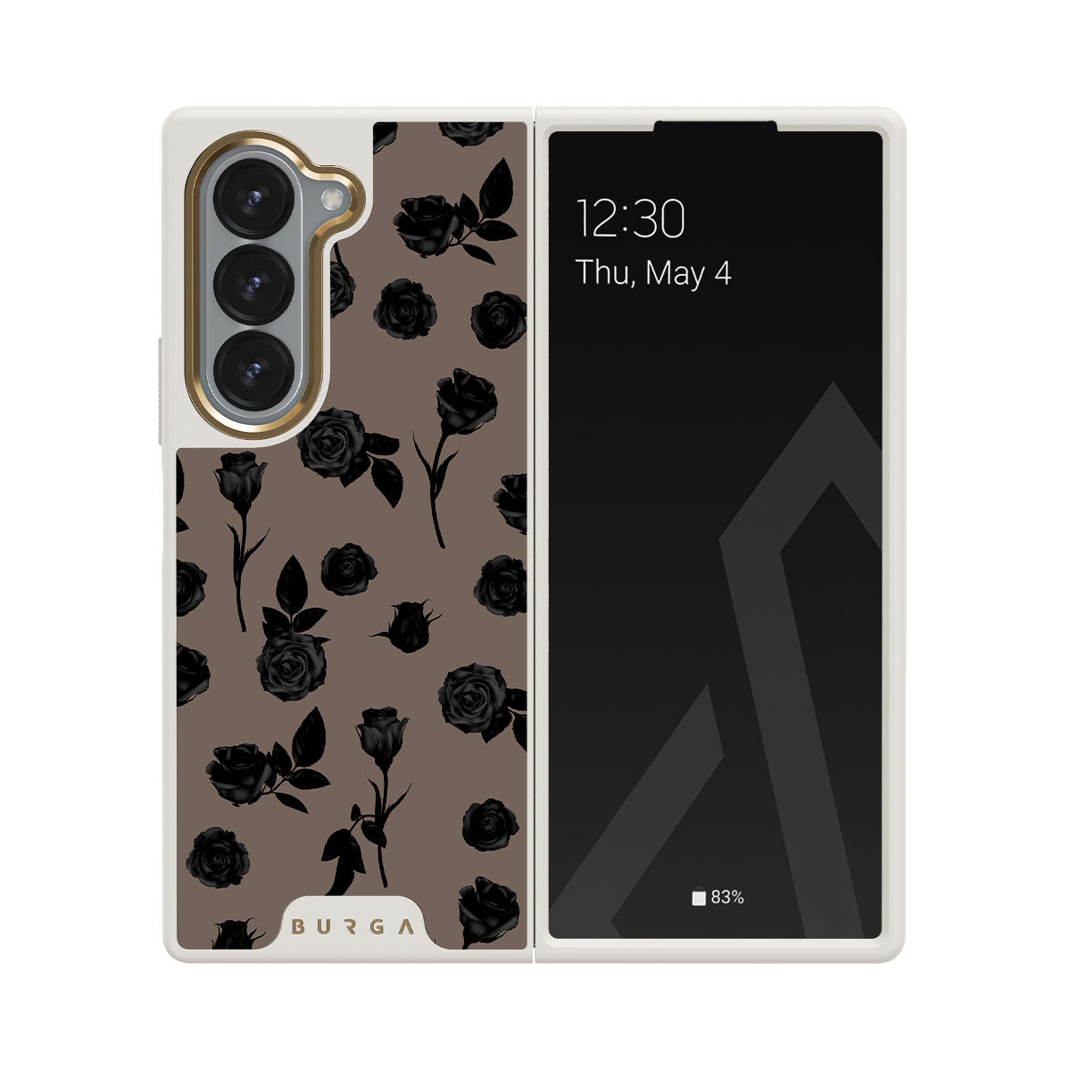 En este diseño: rosas negras, tonos terrosos, detalles florales y flores oscuras.
