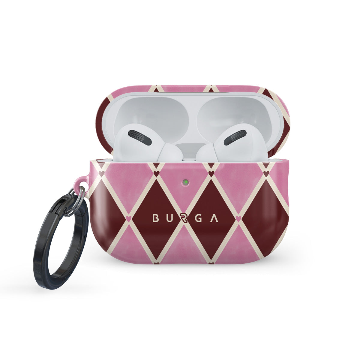 En este diseño: patrón de arlequín, diamantes rosas, fondo rojo profundo.