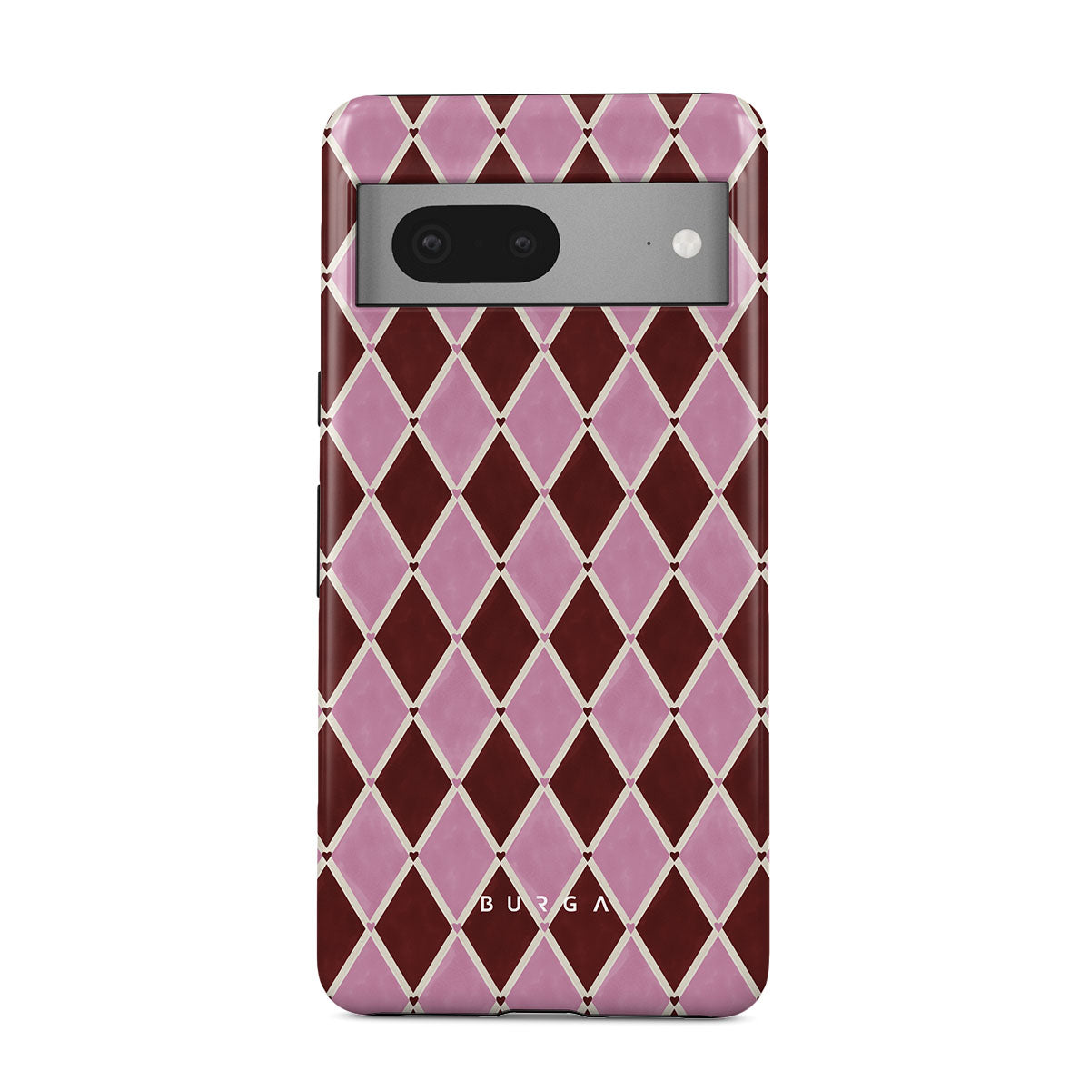 En este diseño: patrón de arlequín, diamantes rosas, fondo rojo profundo.