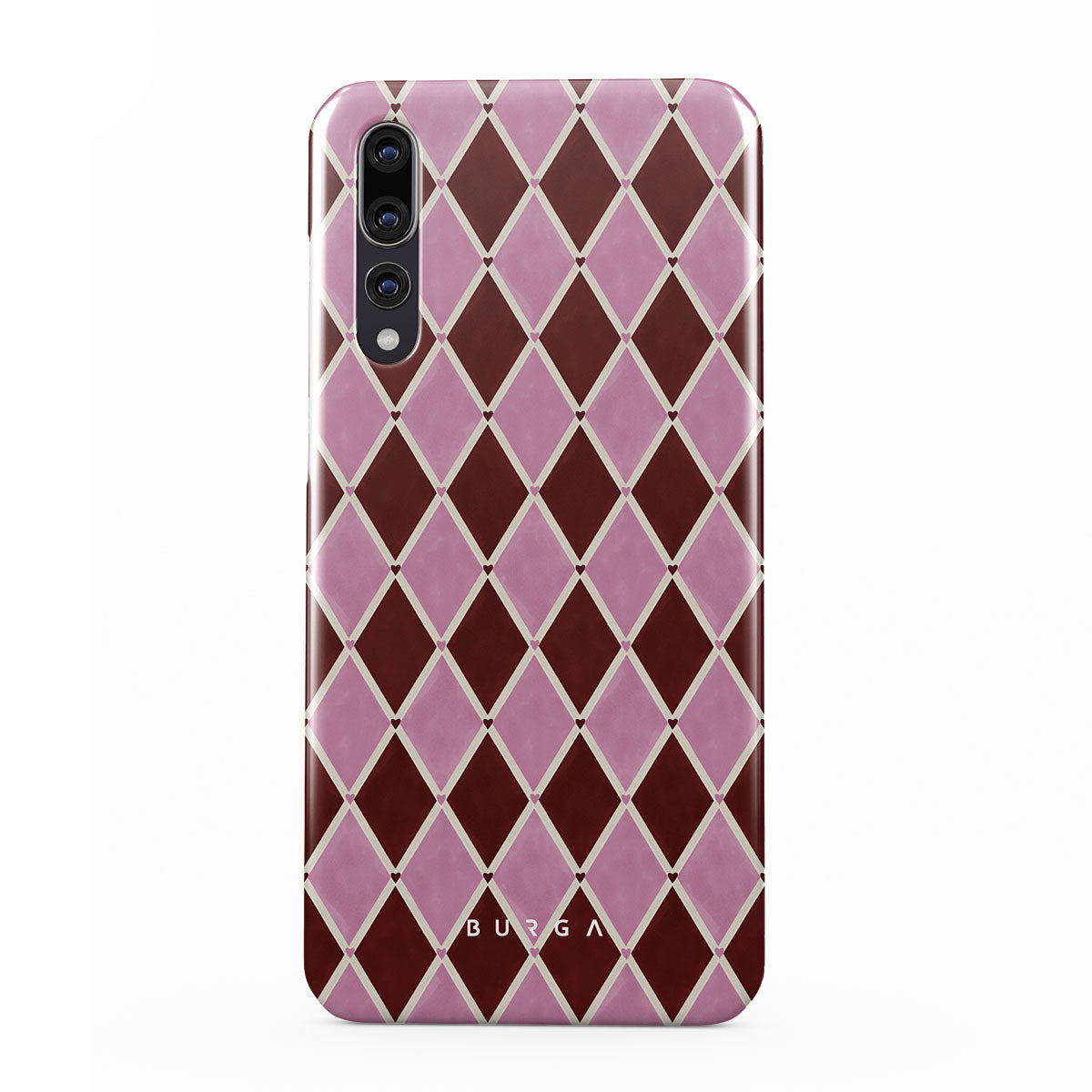 En este diseño: patrón de arlequín, diamantes rosas, fondo rojo profundo.