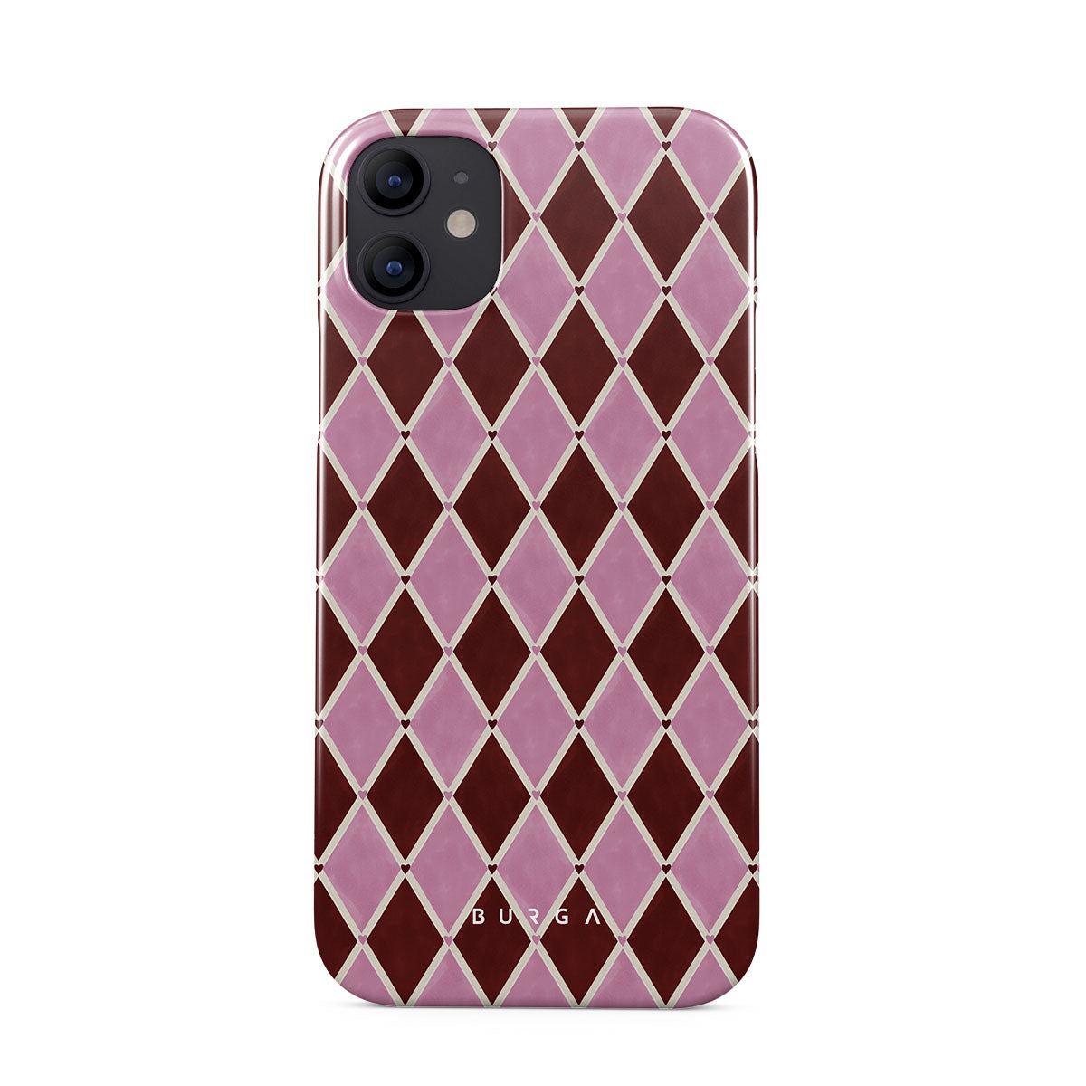 En este diseño: patrón de arlequín, diamantes rosas, fondo rojo profundo.