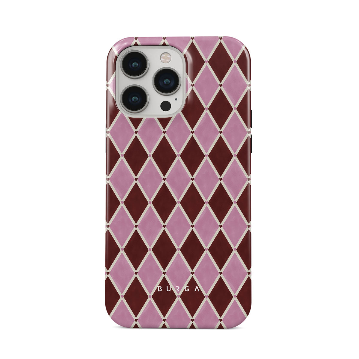 En este diseño: patrón de arlequín, diamantes rosas, fondo rojo profundo.