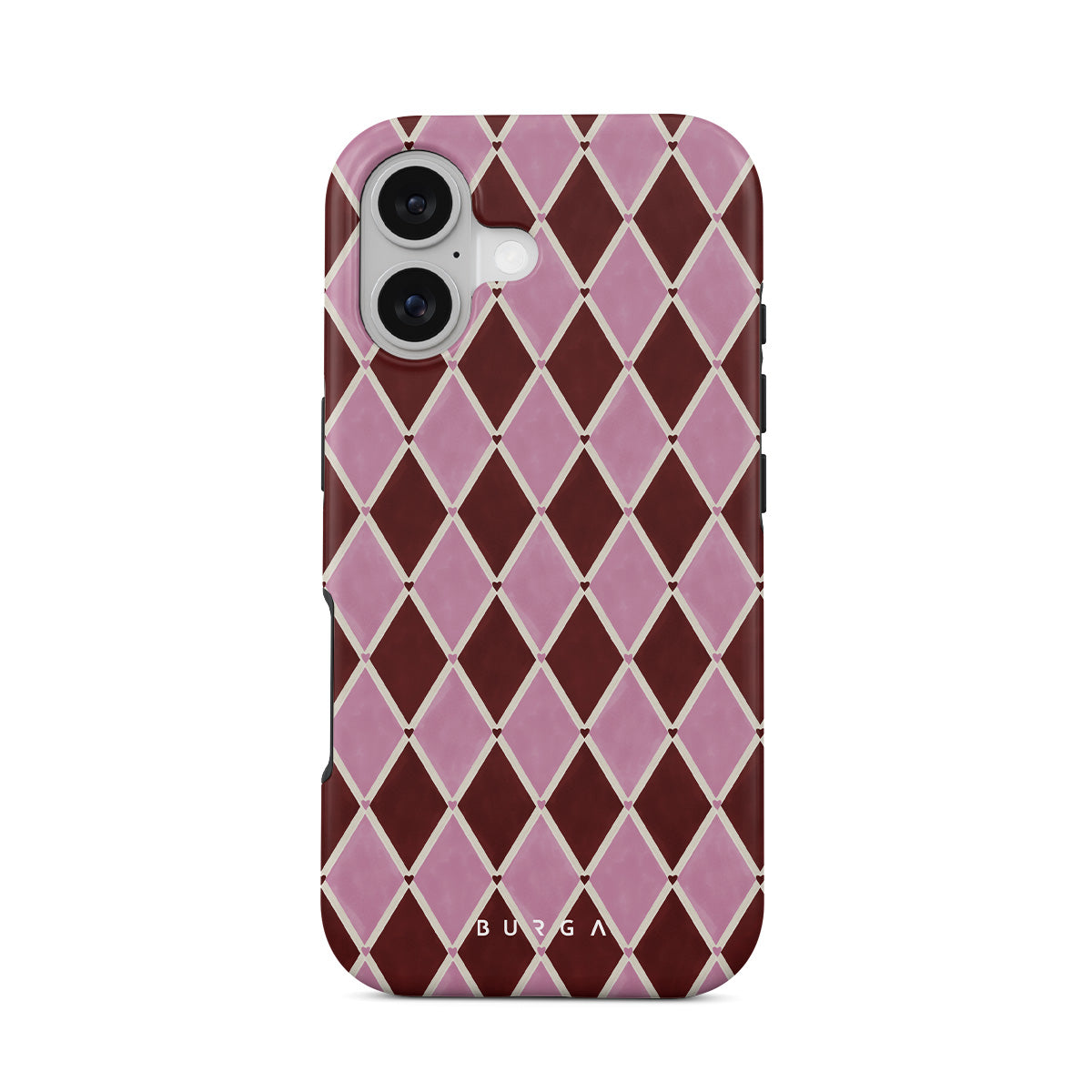 En este diseño: patrón de arlequín, diamantes rosas, fondo rojo profundo.