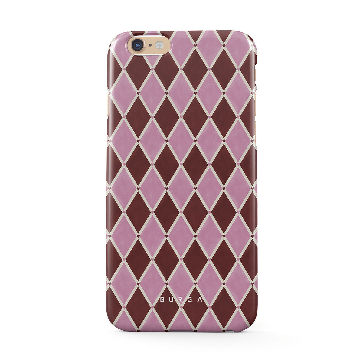 En este diseño: patrón de arlequín, diamantes rosas, fondo rojo profundo.