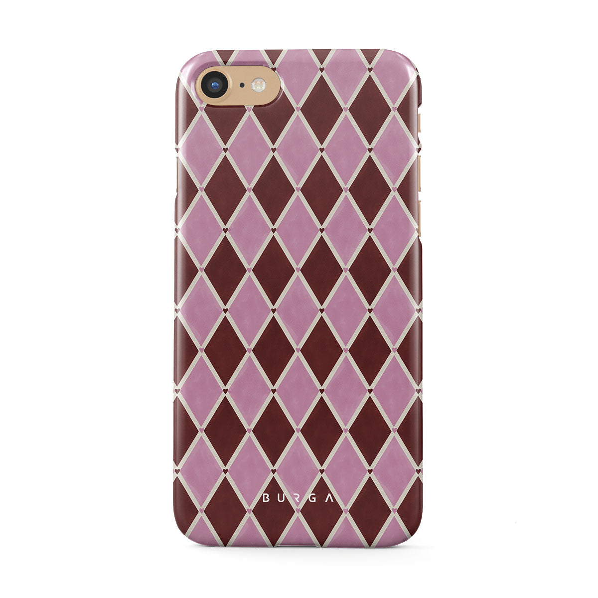 En este diseño: patrón de arlequín, diamantes rosas, fondo rojo profundo.