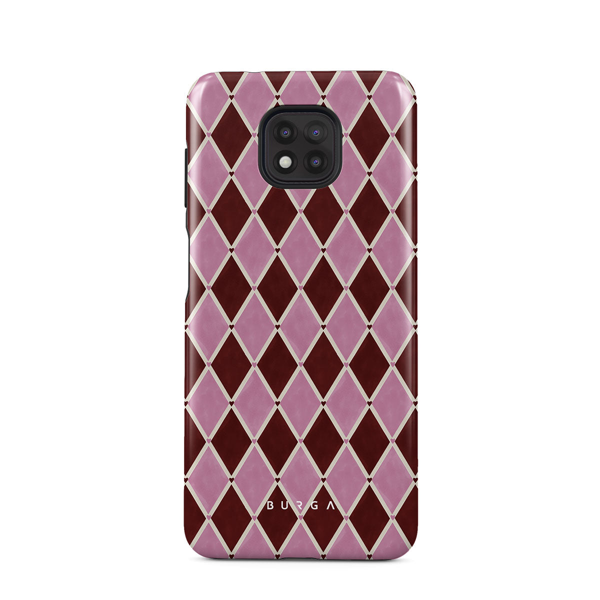 En este diseño: patrón de arlequín, diamantes rosas, fondo rojo profundo.