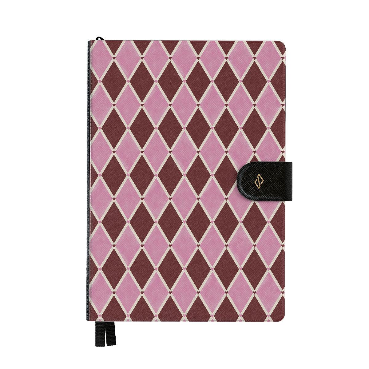 En este diseño: patrón de arlequín, diamantes rosas, fondo rojo profundo.