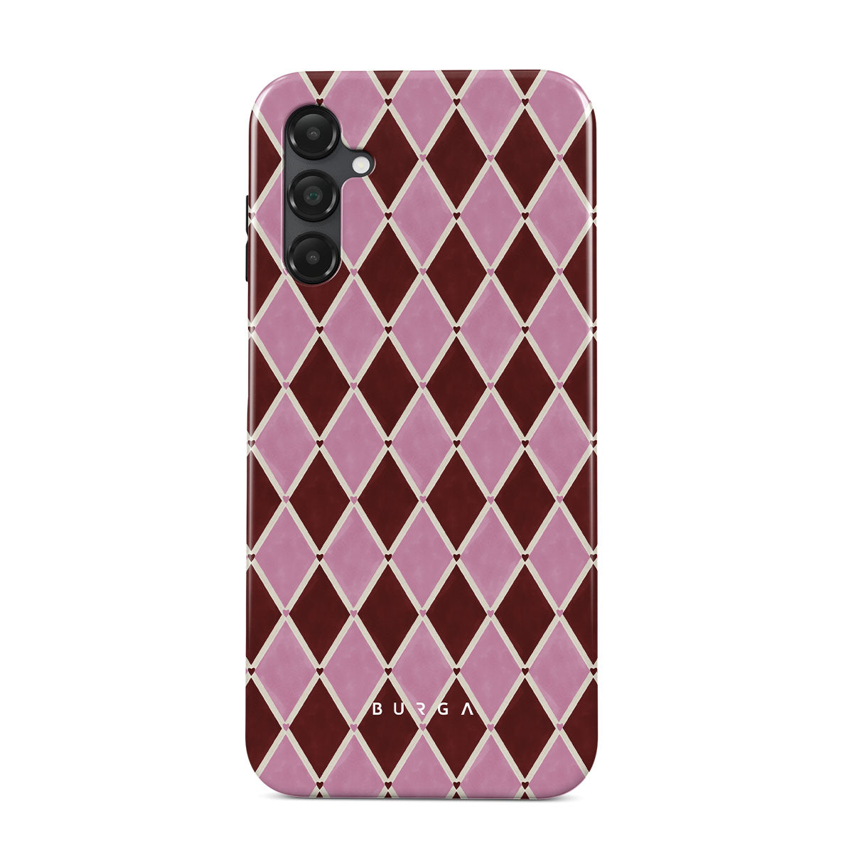 En este diseño: patrón de arlequín, diamantes rosas, fondo rojo profundo.