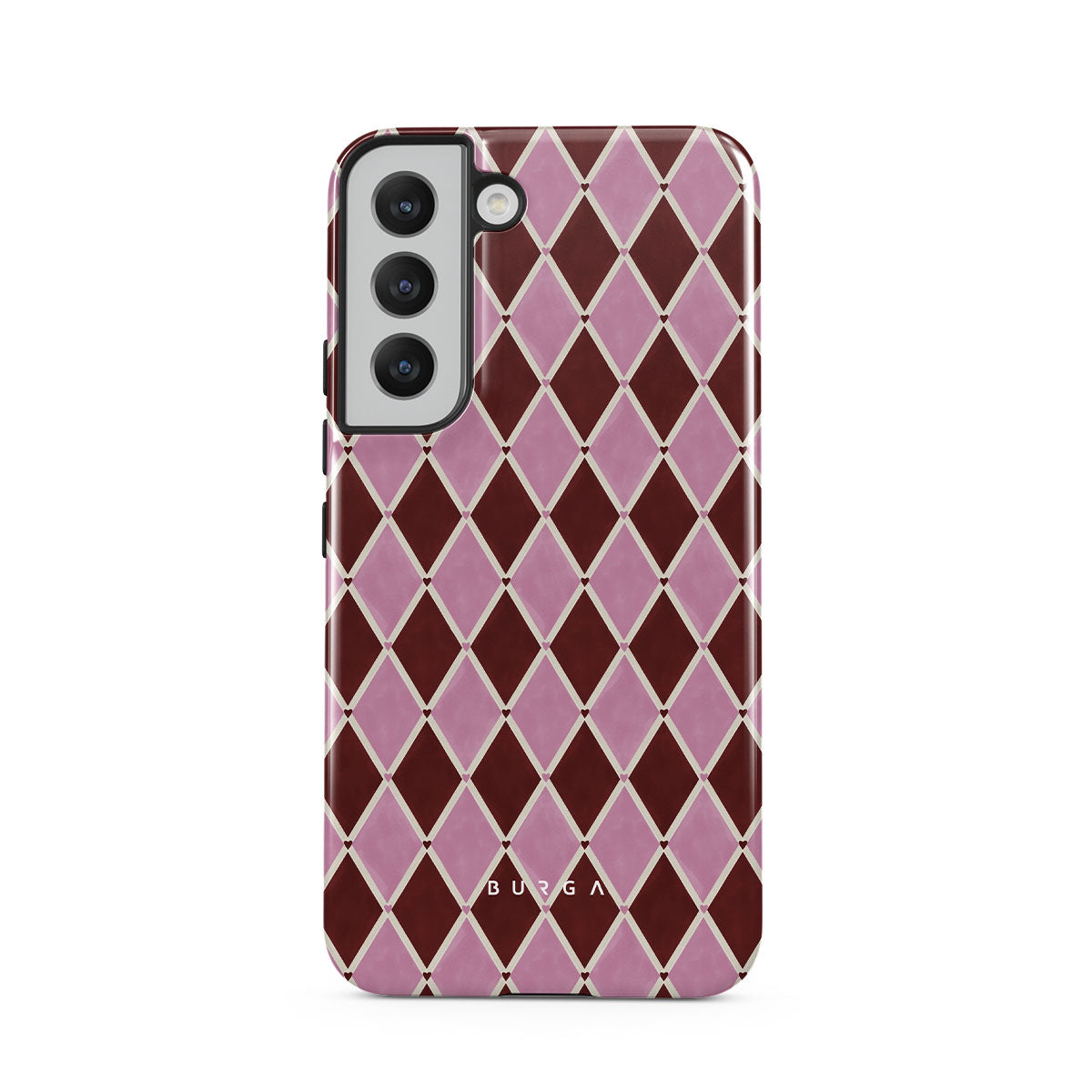 En este diseño: patrón de arlequín, diamantes rosas, fondo rojo profundo.