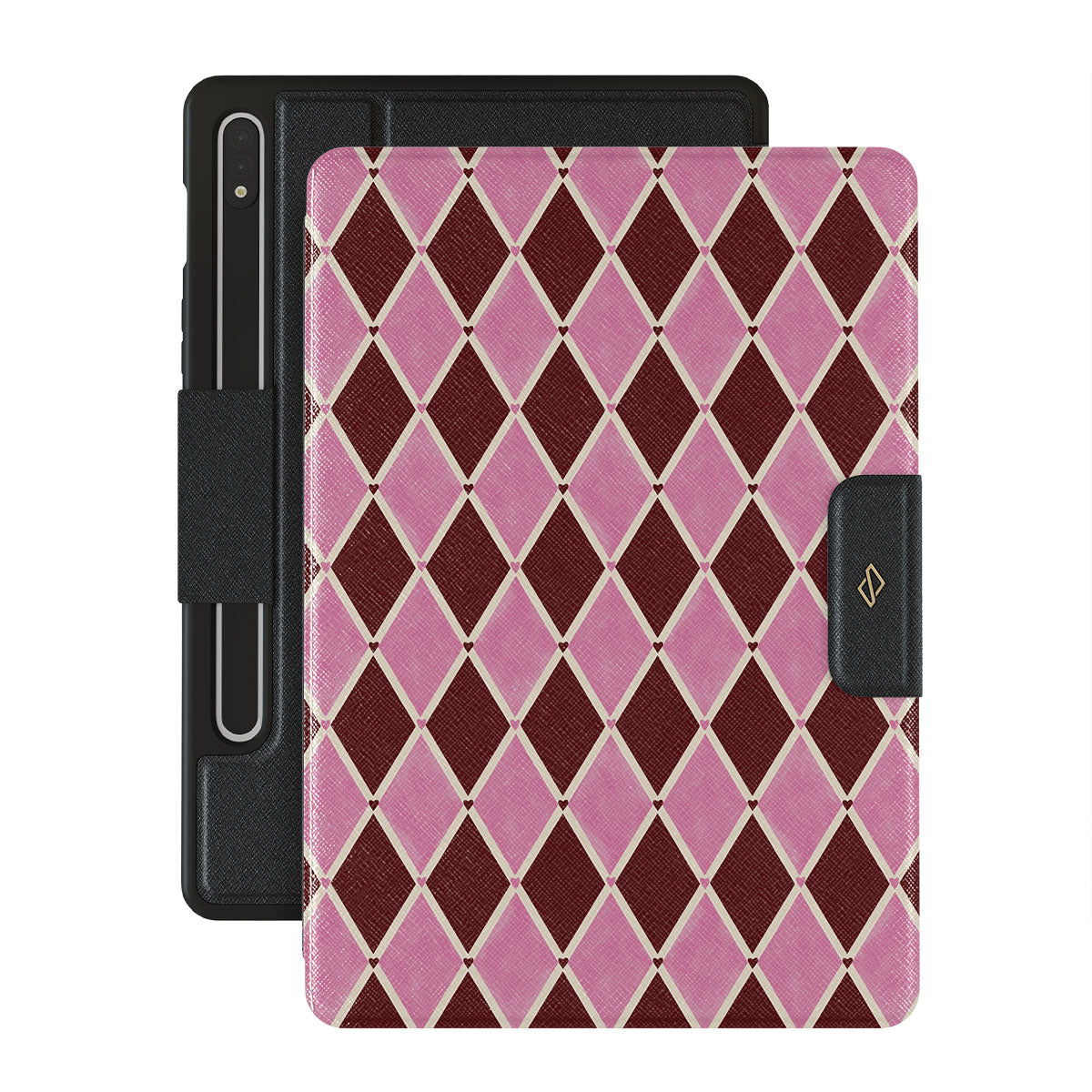 En este diseño: patrón de arlequín, diamantes rosas, fondo rojo profundo.