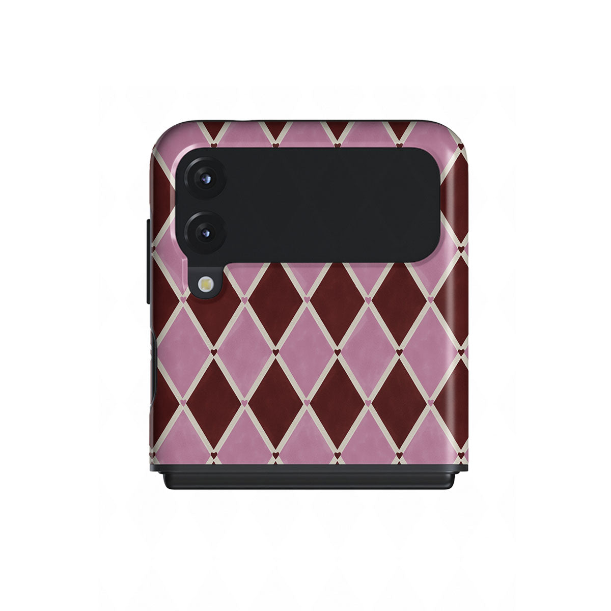 En este diseño: patrón de arlequín, diamantes rosas, fondo rojo profundo.