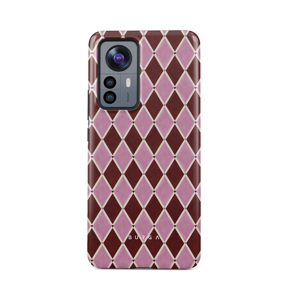 En este diseño: patrón de arlequín, diamantes rosas, fondo rojo profundo.