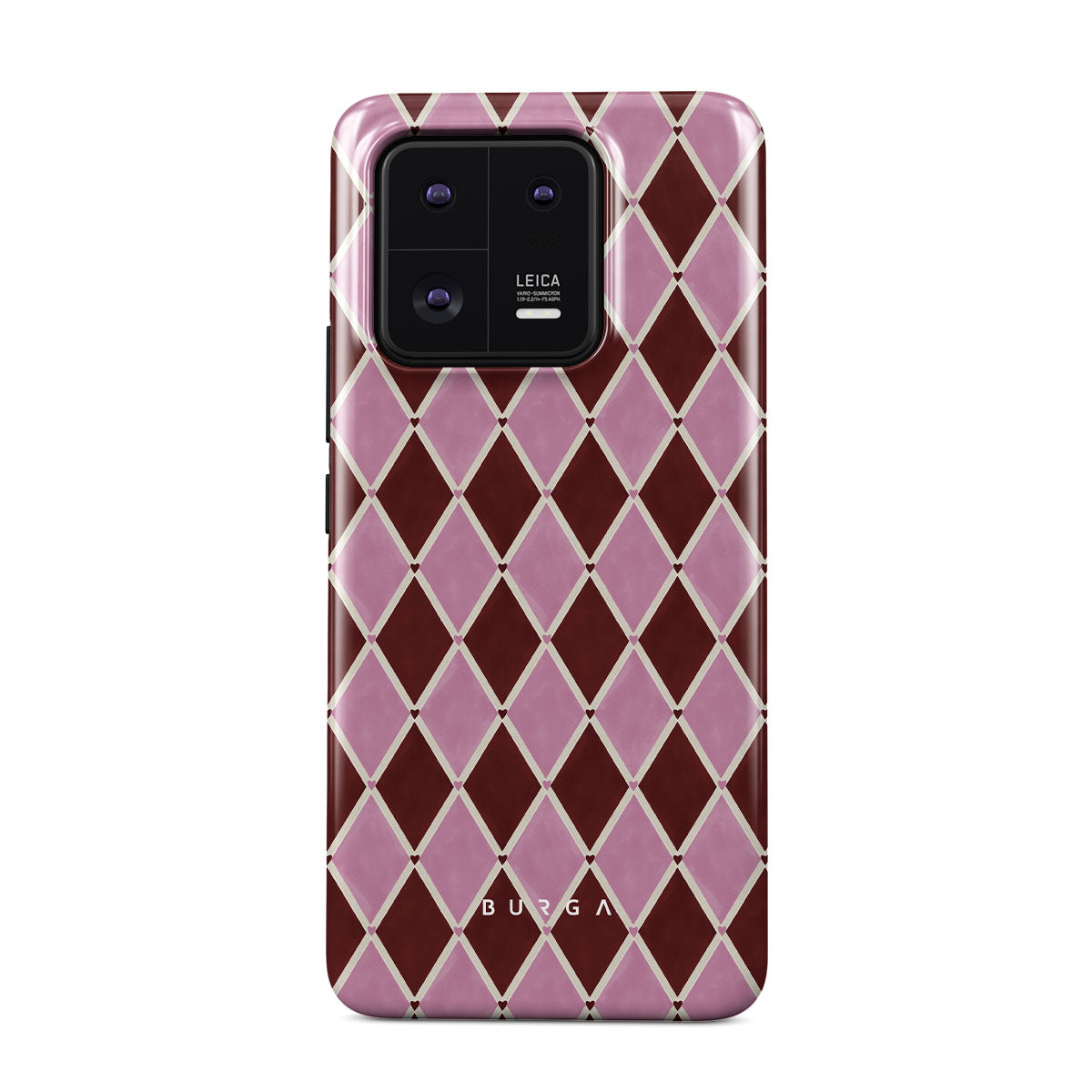 En este diseño: patrón de arlequín, diamantes rosas, fondo rojo profundo.