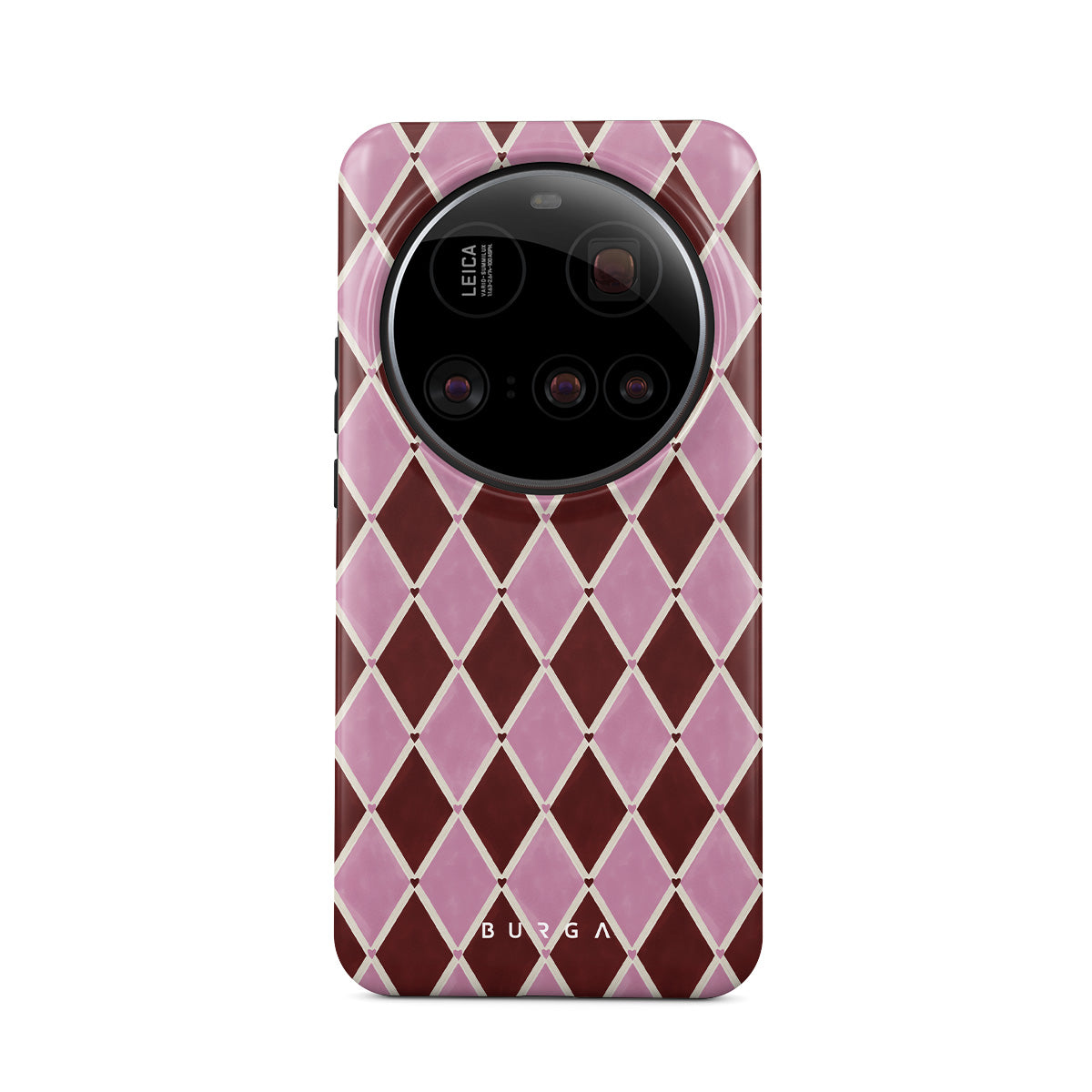 En este diseño: patrón de arlequín, diamantes rosas, fondo rojo profundo.