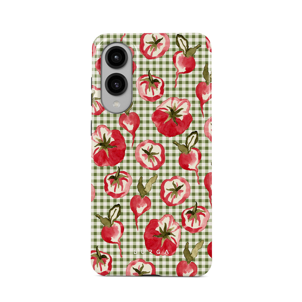Características de este diseño: jitomates, rábanos, cuadros vichy