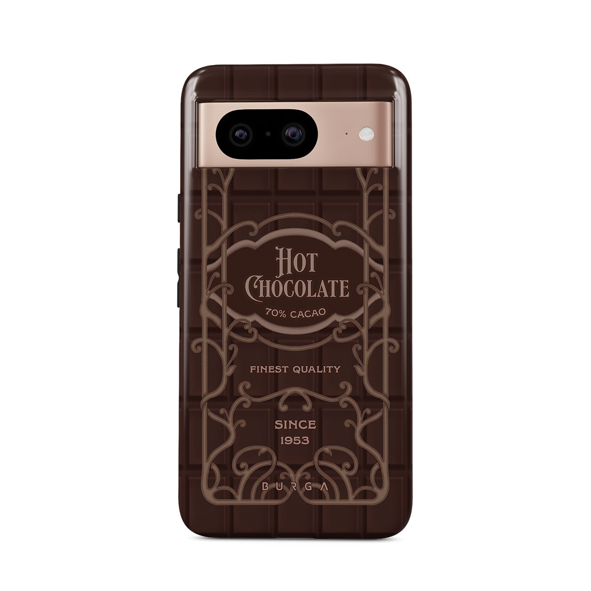 En este diseño: etiqueta de chocolate caliente, diseño de chocolate marrón, estilo retro de empaquetado