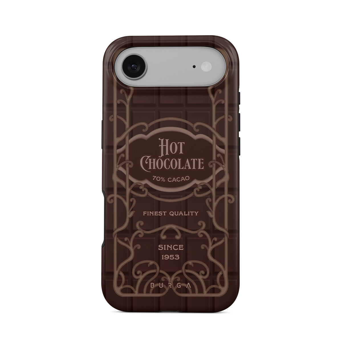 En este diseño: etiqueta de chocolate caliente, diseño de chocolate marrón, estilo retro de empaquetado