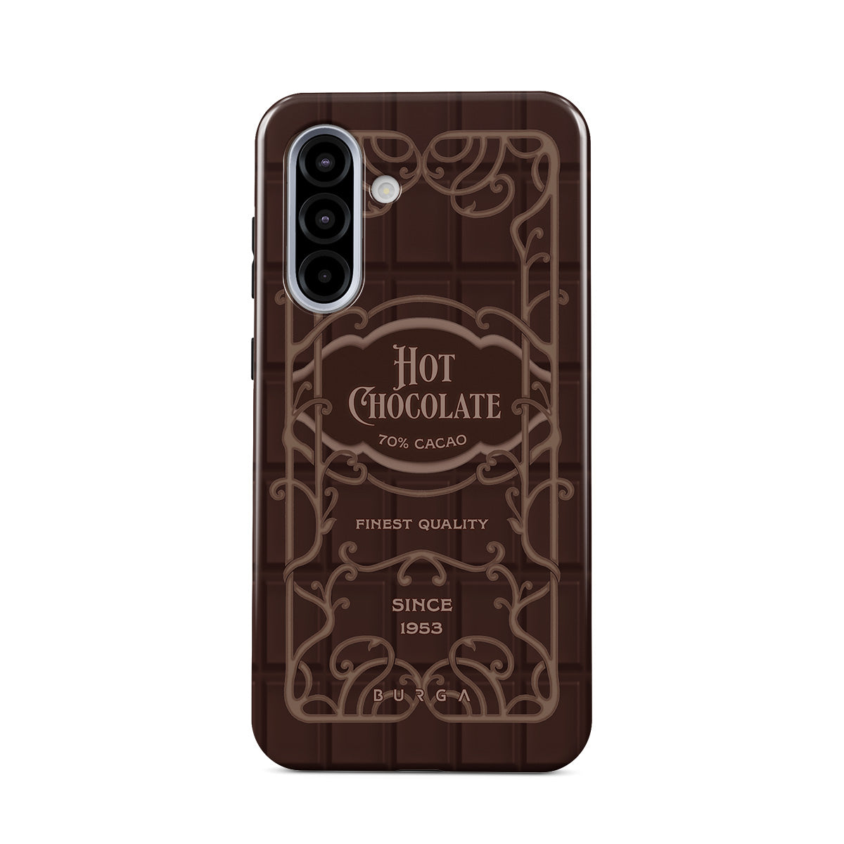 En este diseño: etiqueta de chocolate caliente, diseño de chocolate marrón, estilo retro de empaquetado