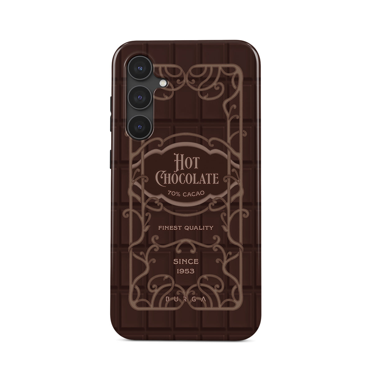 En este diseño: etiqueta de chocolate caliente, diseño de chocolate marrón, estilo retro de empaquetado