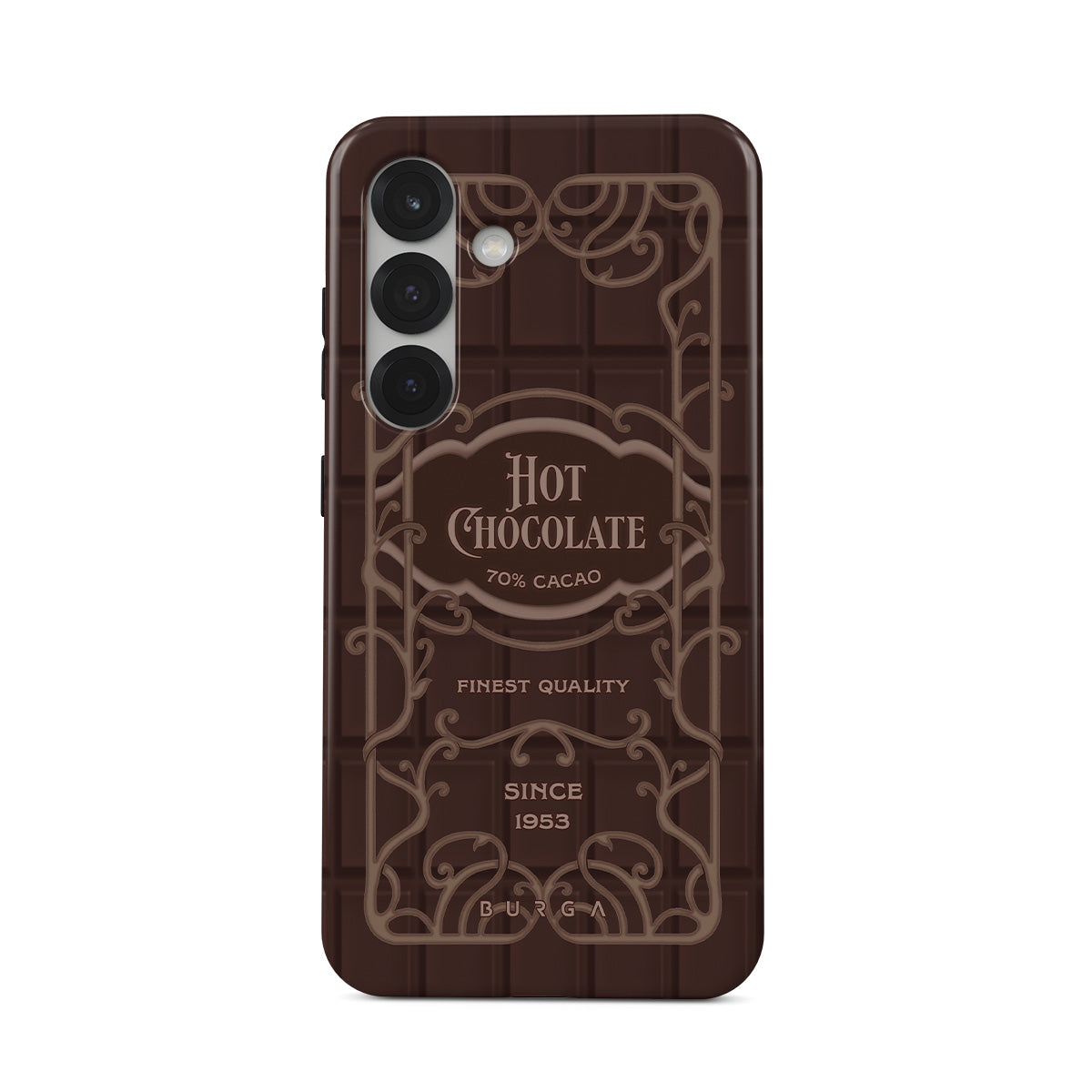 En este diseño: etiqueta de chocolate caliente, diseño de chocolate marrón, estilo retro de empaquetado