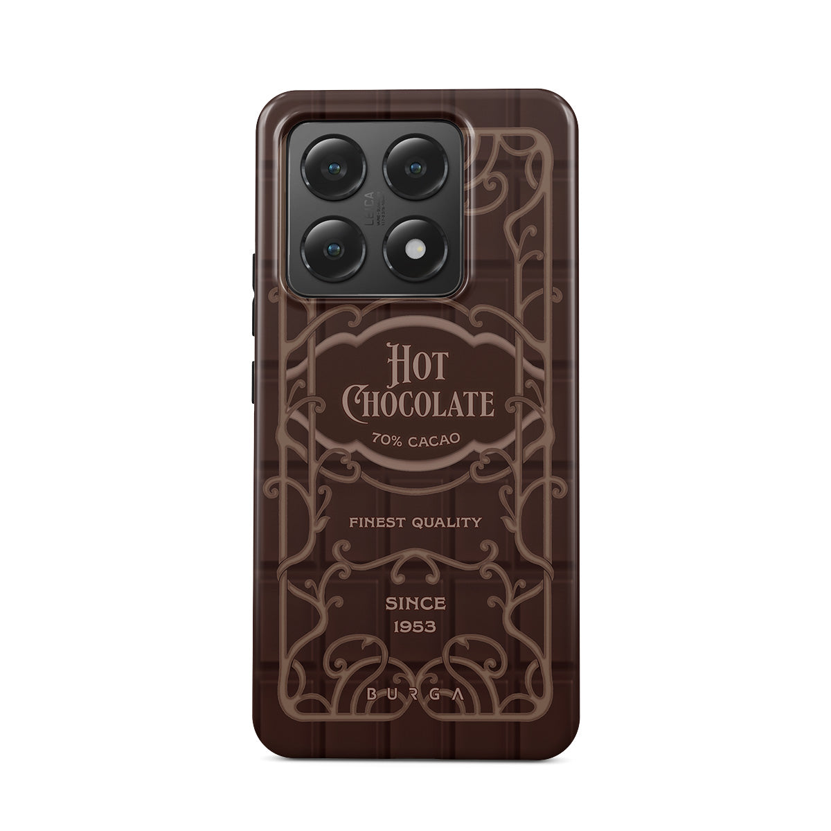 En este diseño: etiqueta de chocolate caliente, diseño de chocolate marrón, estilo retro de empaquetado