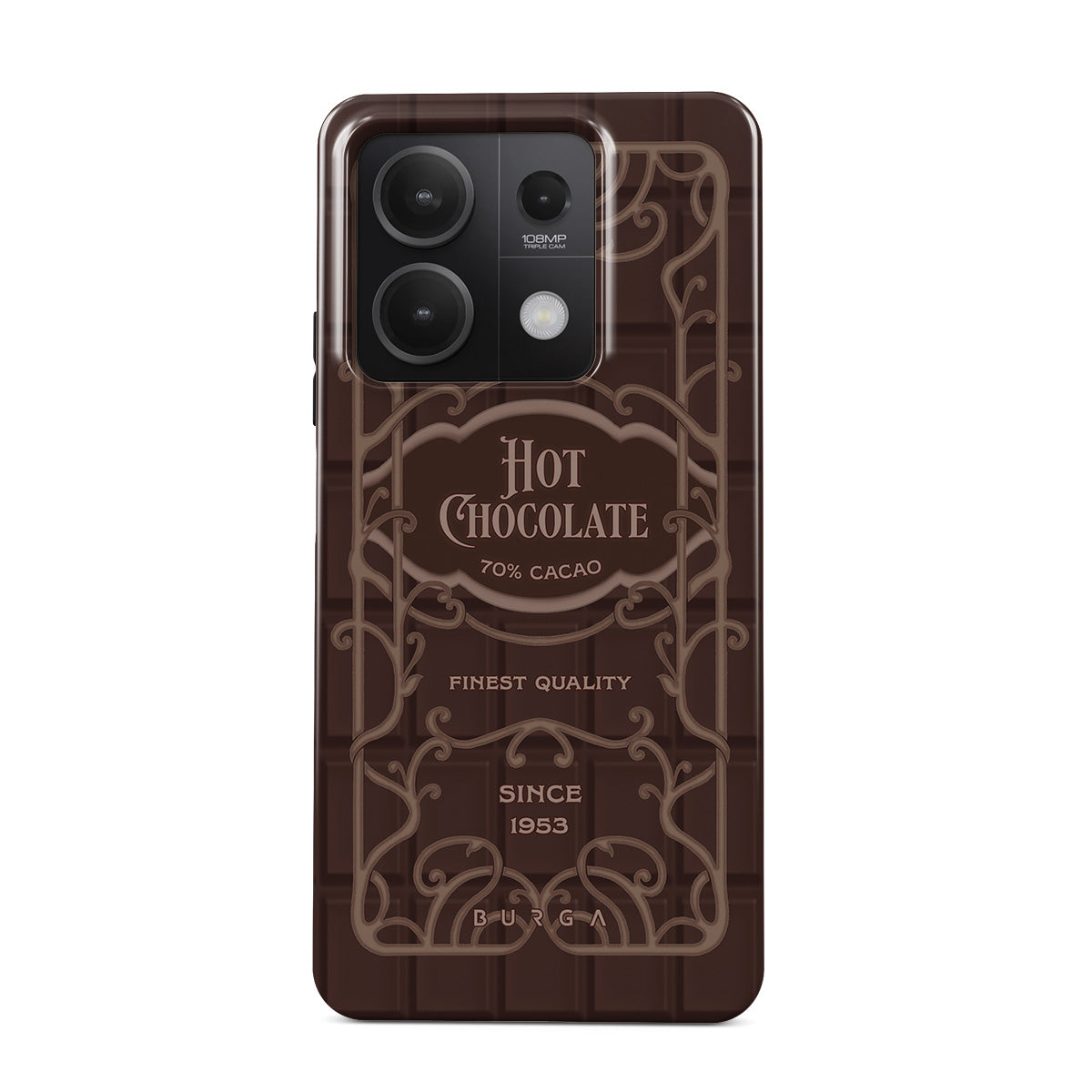 En este diseño: etiqueta de chocolate caliente, diseño de chocolate marrón, estilo retro de empaquetado