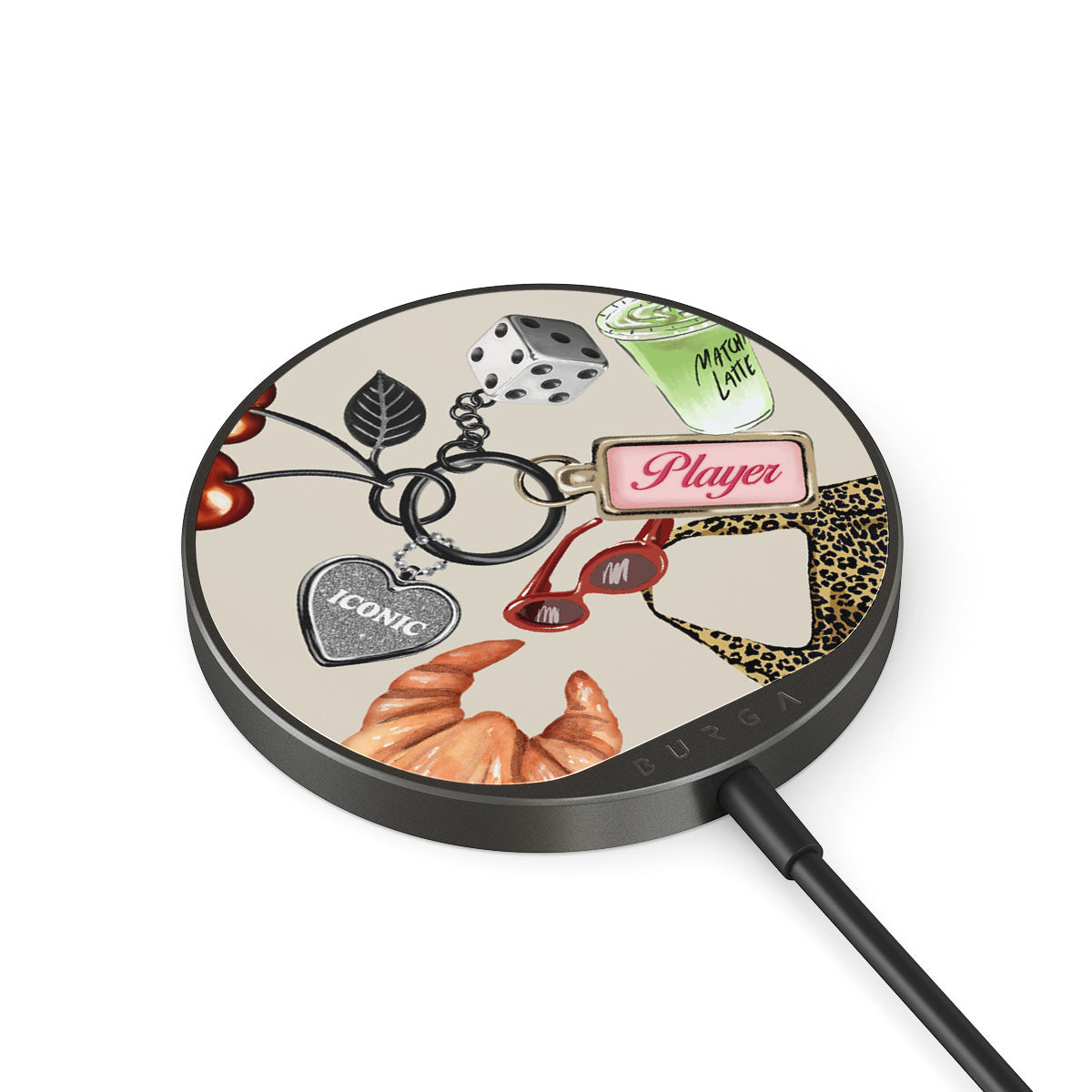 En este diseño: lentes de sol rojas, pintalabios rojo, bebida de matcha verde, croissant, dados negros, bolso de estampado de leopardo, llavero con corazón plateado, cerezas, dados y etiqueta "Player"
