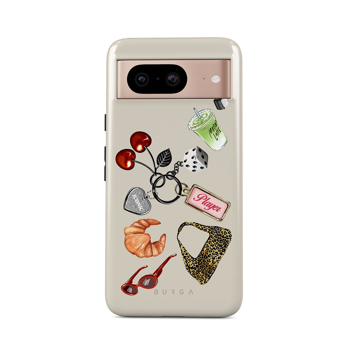 En este diseño: lentes de sol rojas, pintalabios rojo, bebida de matcha verde, croissant, dados negros, bolso de estampado de leopardo, llavero con corazón plateado, cerezas, dados y etiqueta "Player".