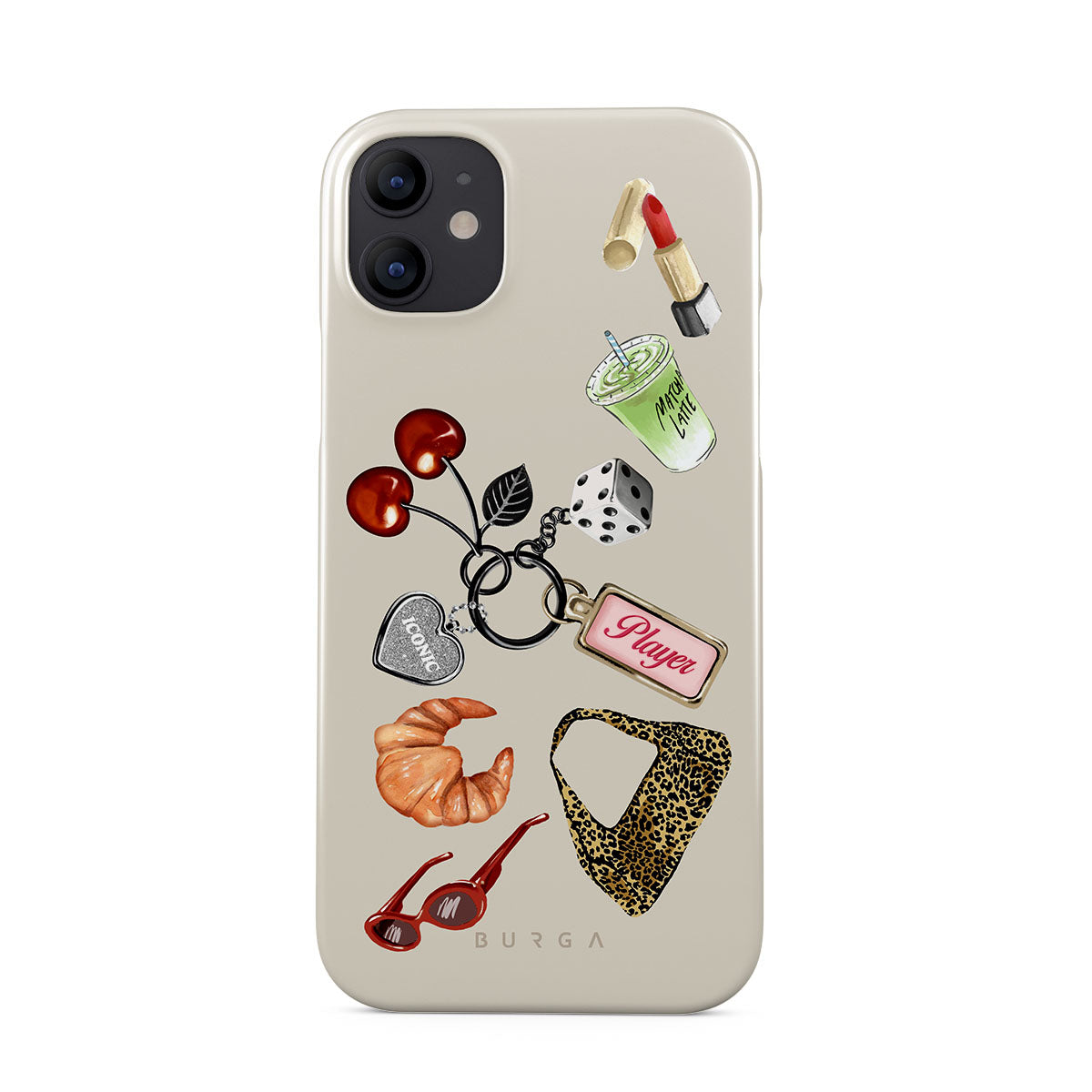 En este diseño: lentes de sol rojas, pintalabios rojo, bebida de matcha verde, croissant, dados negros, bolso de estampado de leopardo, llavero con corazón plateado, cerezas, dados y etiqueta "Player".