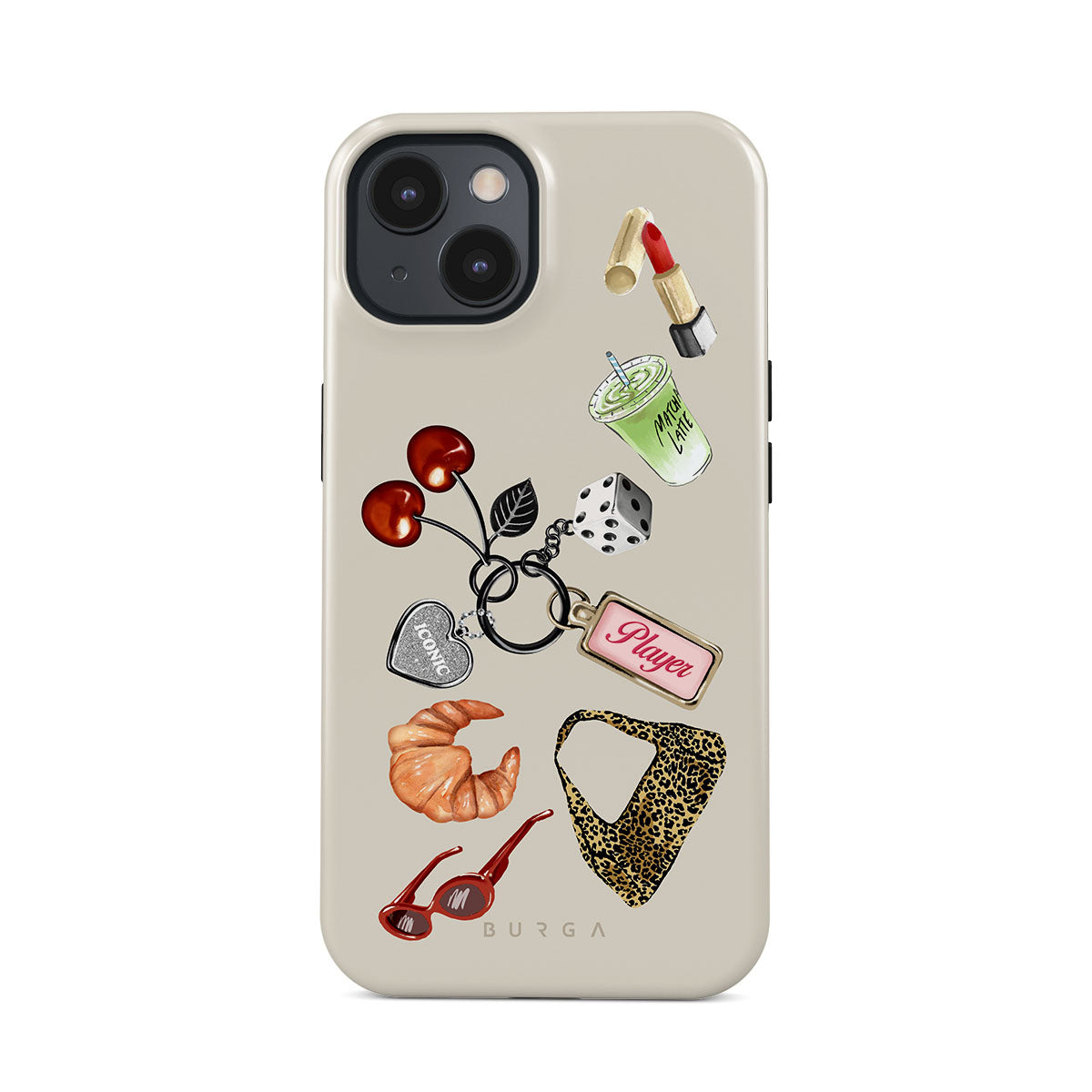 En este diseño: lentes de sol rojas, pintalabios rojo, bebida de matcha verde, croissant, dados negros, bolso de estampado de leopardo, llavero con corazón plateado, cerezas, dados y etiqueta "Player".