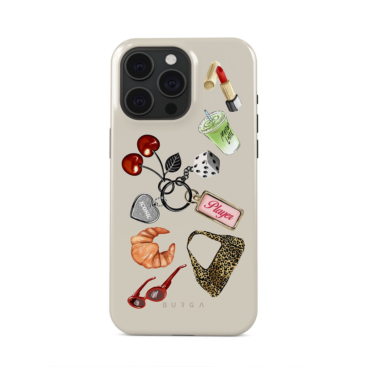 En este diseño: lentes de sol rojas, pintalabios rojo, bebida de matcha verde, croissant, dados negros, bolso de estampado de leopardo, llavero con corazón plateado, cerezas, dados y etiqueta "Player".
