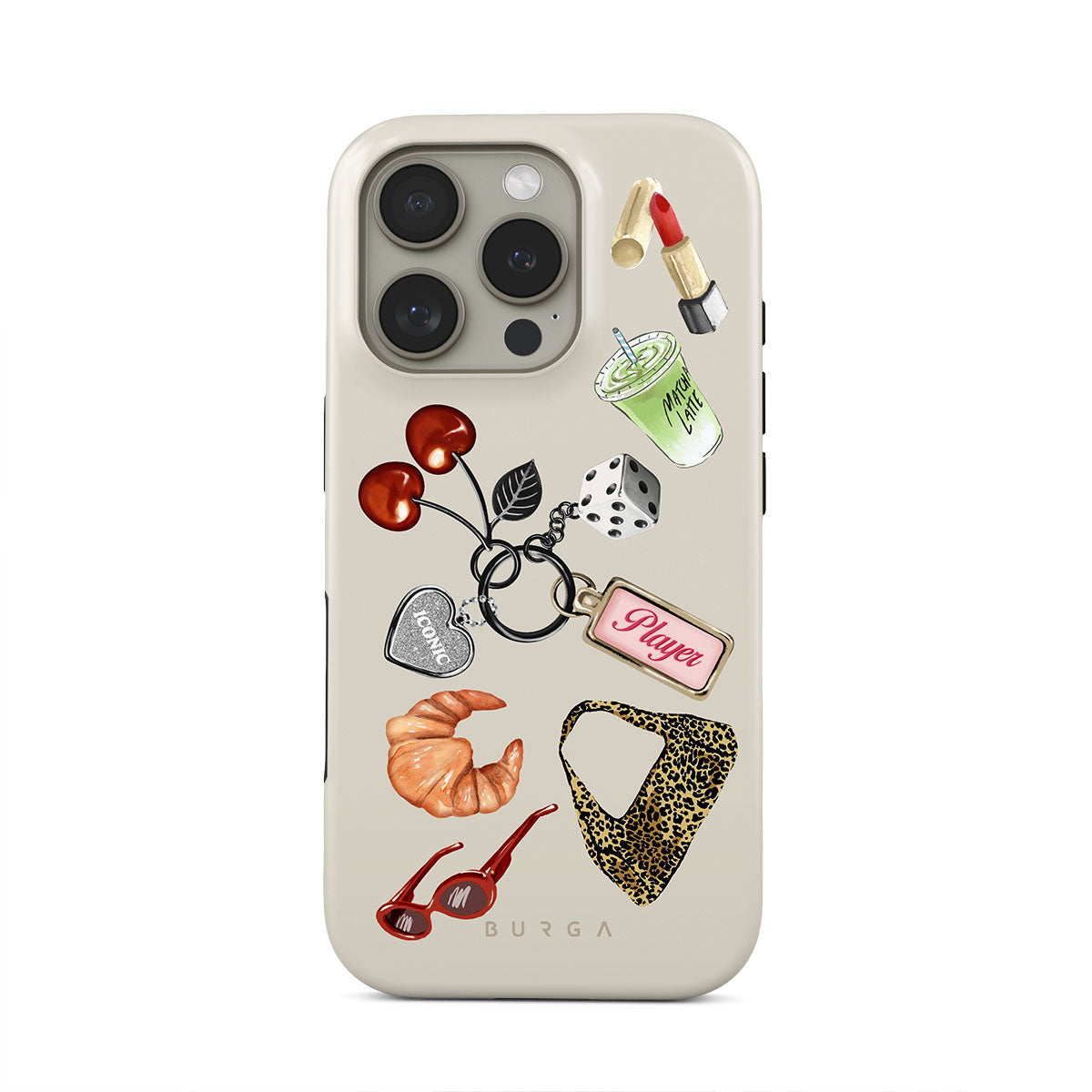 En este diseño: lentes de sol rojas, pintalabios rojo, bebida de matcha verde, croissant, dados negros, bolso de estampado de leopardo, llavero con corazón plateado, cerezas, dados y etiqueta "Player".