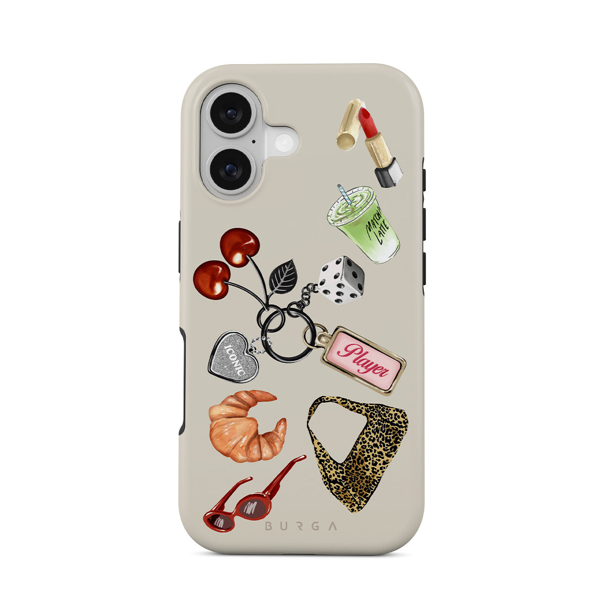 En este diseño: lentes de sol rojas, pintalabios rojo, bebida de matcha verde, croissant, dados negros, bolso de estampado de leopardo, llavero con corazón plateado, cerezas, dados y etiqueta "Player".