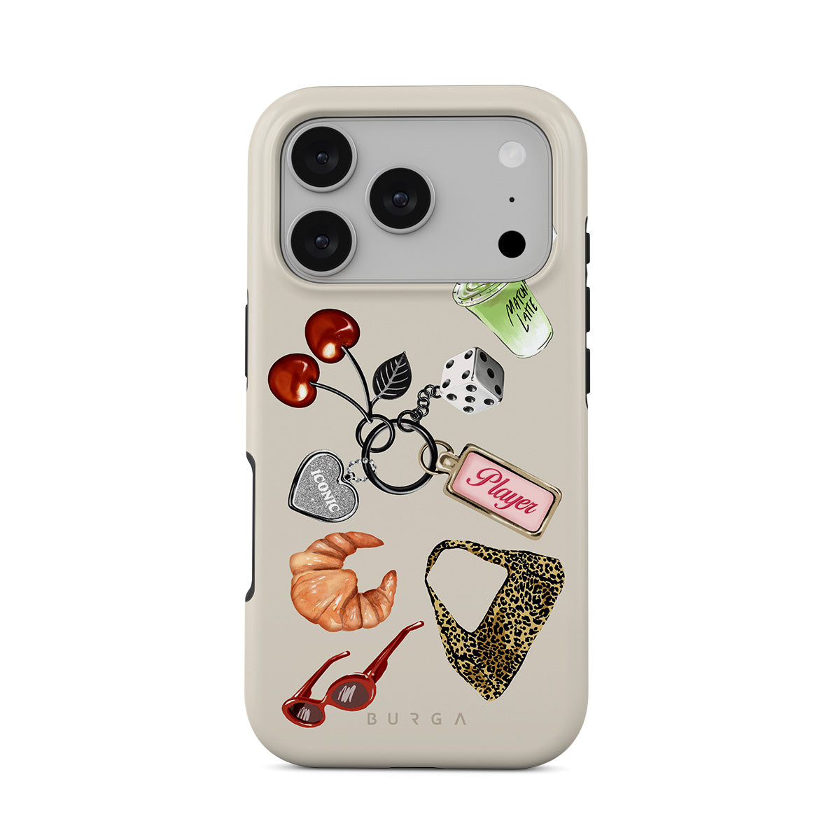 En este diseño: lentes de sol rojas, pintalabios rojo, bebida de matcha verde, croissant, dados negros, bolso de estampado de leopardo, llavero con corazón plateado, cerezas, dados y etiqueta "Player".
