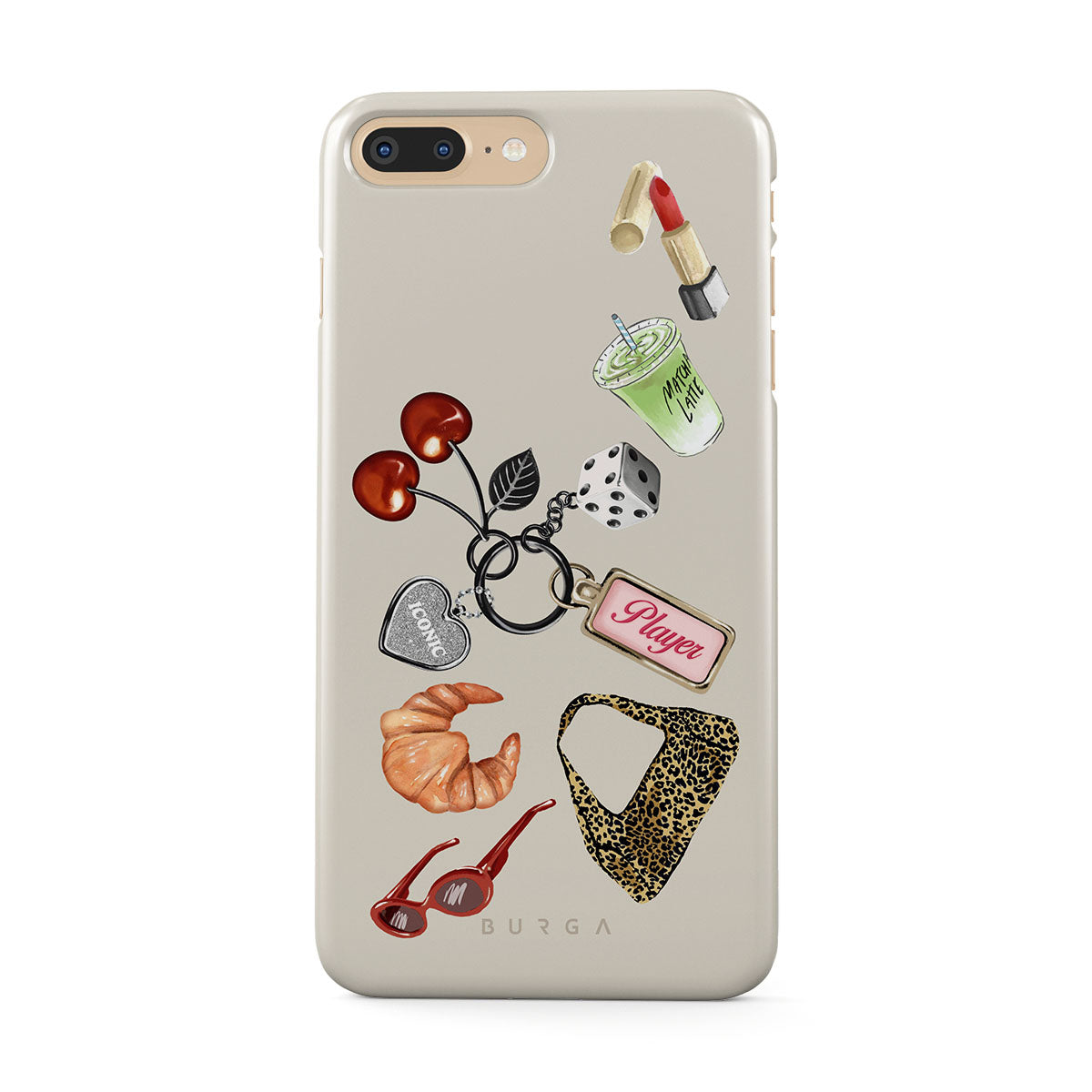 En este diseño: lentes de sol rojas, pintalabios rojo, bebida de matcha verde, croissant, dados negros, bolso de estampado de leopardo, llavero con corazón plateado, cerezas, dados y etiqueta "Player".
