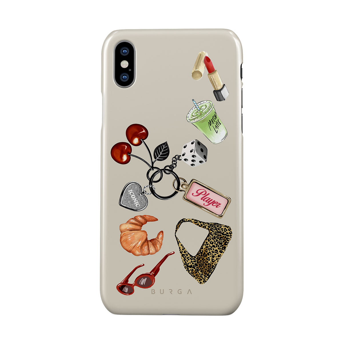 En este diseño: lentes de sol rojas, pintalabios rojo, bebida de matcha verde, croissant, dados negros, bolso de estampado de leopardo, llavero con corazón plateado, cerezas, dados y etiqueta "Player".