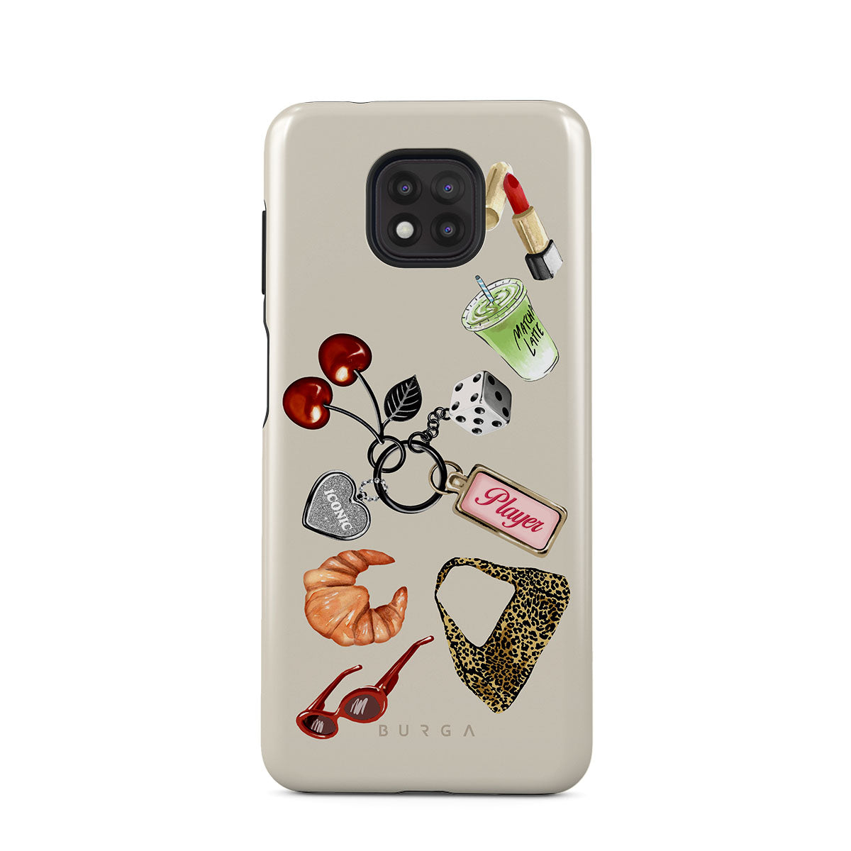En este diseño: lentes de sol rojas, pintalabios rojo, bebida de matcha verde, croissant, dados negros, bolso de estampado de leopardo, llavero con corazón plateado, cerezas, dados y etiqueta "Player".