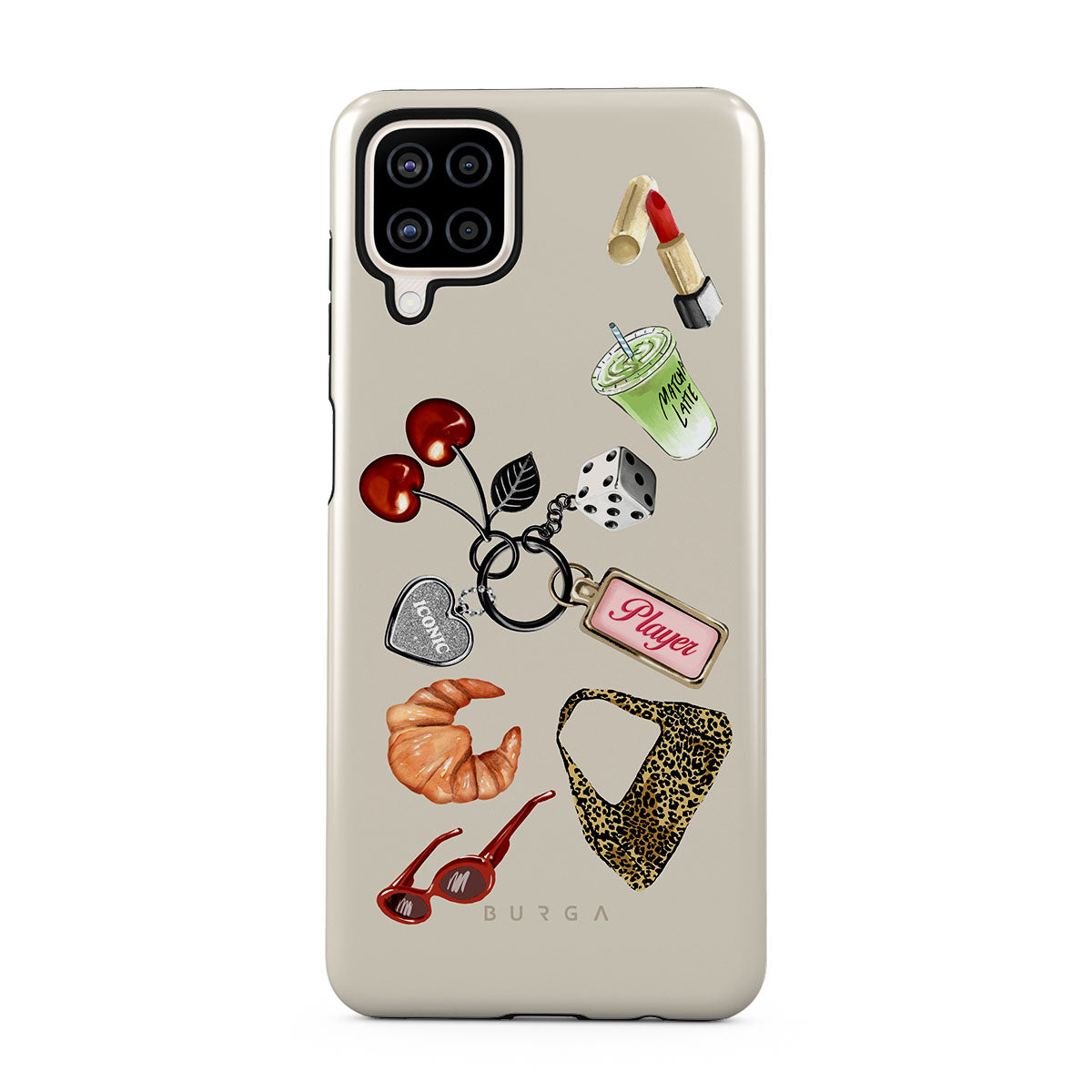 En este diseño: lentes de sol rojas, pintalabios rojo, bebida de matcha verde, croissant, dados negros, bolso de estampado de leopardo, llavero con corazón plateado, cerezas, dados y etiqueta "Player".
