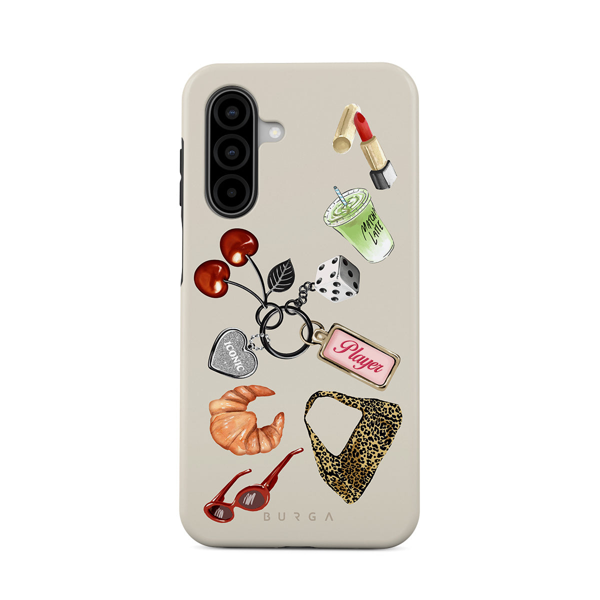 En este diseño: lentes de sol rojas, pintalabios rojo, bebida de matcha verde, croissant, dados negros, bolso de estampado de leopardo, llavero con corazón plateado, cerezas, dados y etiqueta "Player".